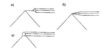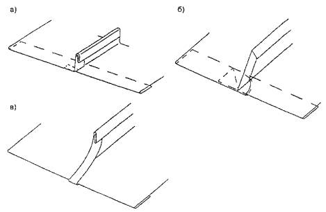 а и б - с квадратными кромками; в - со скошенными кромками Рисунок 14 - Формы стоячего фальца у карниза 8.1.4 Стоячий фальц листов кровли на карнизе всегда должен быть доведен до края кровли (рисунок 14). 8.1.5