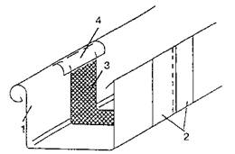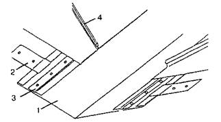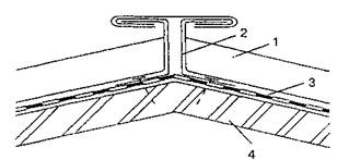 1 - картина разжелобка; 2 - медный кляммер; 3 - фасонный дополнительный медный кляммер; 4 - двойной стоячий фальц с квадратными кромками Рисунок 22 - Разжелобок с дополнительным лежачим фальцем, препятствующим перемещению медной кровли