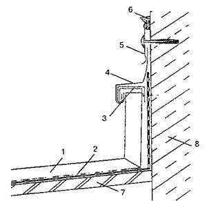 1 - медная фальцевая кровля; 2 - подстилающий слой; 3 - медный кронштейн; 4 - медный фартук водослива; 5 - медный фасонный элемент; 6 - герметизирующая мастика; 7 - основание под кровлю; 8 - стена Рисунок 19 - Примыкание медной кровли к стене 8.4 Ендова8.4.1 Разжелобки могут выполняться с двойным стоячим фальцем (рисунок 20), с лежачим фальцем (рисунки 21 и 22), а также углубленными (рисунок 23) При двойном стоячем фальце для восприятия