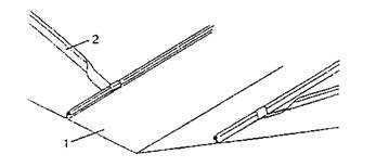 1 - картина разжелобка; 2 - двойной стоячий фальц со скошенными кромками Рисунок 20 - Разжелобок с двойным стоячим фальцем с двух сторон 8.4.2 Соединение картин разжелобка с основанием может выполняться рядовым кляммером (рисунок 21), а картин фальцевой кровли - дополнительным сплошным фасонным кляммером (рисунок 22). Такая конструкция разжелобка и его закрепление обеспечивают компенсацию температурных деформаций кровли.