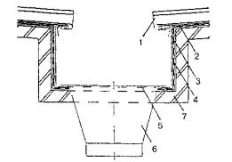 1 - стоячий фальц с квадратными кромками; 2 - карнизные планки; 3 - медная обделка желоба; 4 - подстилающий слой; 5 - медная решетка; 6 - воронкообразный водослив из кровельной меди; 7 - основание Рисунок 26 - Внутренний желоб 9.1.4 При наличии парапета стены применяют внутренний, заглубленный в кровлю желоб (рисунок 26). При устройстве такого желоба особое внимание следует уделять герметичности сопряжения желоба с водосливом. 9.1.5 Для исключения возможности замерзания воды и образования льда в желобах в зимний период должна быть предусмотрена система их обогрева. 9.2 Крепление подвесного желоба9.2.1 Карнизные водосточные желоба полукруглого и коробчатого сечений крепят к основанию на медных кронштейнах соответствующего сечения (рисунок 27).