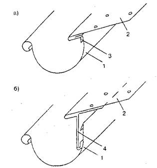 1 - полукруглый желоб; 2 - карнизная планка; 3 - короткий вертикальный свес; 4 - длинный вертикальный свес Рисунок 29 - Крепление за желоб карнизной планки с коротким вертикальным свесом (а) и длинным вертикальным свесом (б) 9.2.7 Карнизные планки вдоль карниза