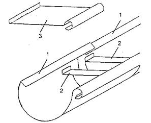 1 - полукруглый желоб; 2 - ограничитель; 3 - медная покрывающая полоса Рисунок 30 - Температурный шов желобов при скользящем их соединении