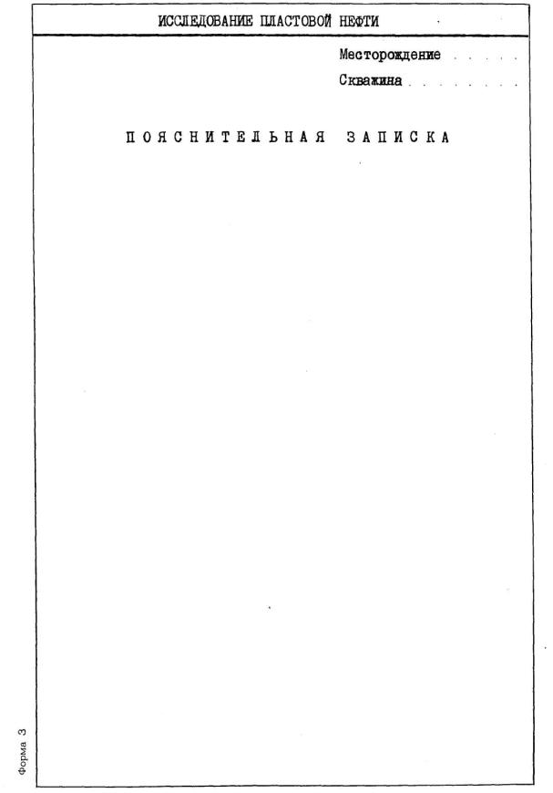 - в поле 3 указывают должность и фамилию руководителя подразделения, в котором проводились исследования; - в поле 4 указывают административный пункт расположения организации-исполнителя и год выпуска отчета, например: "Энск - 1977". 3.2.2.2. Форма 2."Содержание отчета" (оглавление). 3.2.2.3. Форма 3."Пояснительная записка". В пояснительной записке должны содержаться краткие сведения о выполненном исследовании: - основание (тематический план, внеплановое задание, контрольное исследование); - производилось ли ранее исследование пластовой нефти из этой скважины (дать ссылку на соответствующий отчет) или исследование производится впервые; - какие пробы исследовались: глубинные или рекомбинированные; - мероприятия, предшествовавшие отбору проб (очистка скважины от парафина, гидродинамические исследования, дебитометрирование, кислотная обработка, гидроразрыв, дополнительная перфорация и др.); - результаты проверки идентичности проб по п. 1.13 оформляют в виде таблицы; в графу "контрольный параметр" записывают либо "Давление в приемной камере", либо "Давление насыщения", в графе "Идентичность проб" пишут "Да" или "Нет", под таблицей указывают номера проб, выбранных для исследования, например: