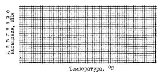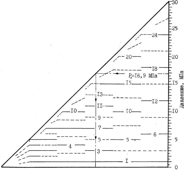 Правило нахождения промежуточной температуры Для нахождения промежуточной температуры по п. 2.2.6 на горизонтальной шкале откладывают значение пластовой температуры и восстанавливают перпендикуляр до пересечения с наклонной линией графика. Из точки пересечения проводят горизонтальную линию до пересечения с вертикальной шкалой, на которой читают значение промежуточной температуры. Пример 1. Пластовая температура 77 °C. По графику находят промежуточную температуру 50 °С. Следовательно температуры эксперимента будут: 20, 50 и 77 °С. Пример 2. Пластовая температура 130 °С. По графику находят промежуточную температуру на границе 70 и 80 °С. Следовательно, температуры эксперимента будут: 20, 80 и 130 °С. ПРИЛОЖЕНИЕ 8ОбязательноеГрафик для определения давления ступеней в двухфазной области