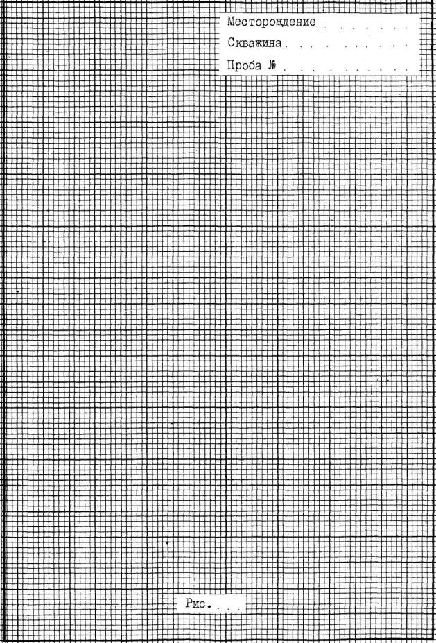 3.4.3. Для построения графиков установлено четыре разновидности формы 18; - форма 18, вертикальный лист, формат А4; - форма 18а, горизонтальный лист, формат А4;. - форма 18б, вертикальный лист, формат А3; - форма 18в; горизонтальный лист, формат А3. Основными формами являются формы 18 и 18а. Формы 18б и 18в используются в тех случаях, когда размеры графиков не позволяют поместить их на основных формах. форма 18 дана в приложении 1. 3.4.4. Индивидуальная карточка для комплексов А и Ас (п. 3.1.3) должна быть выполнена на обеих сторонах листа плотной бумаги форматом А4 по ГОСТ 9327-60 (форма ИК, приложение 1), 3.4.5. Нумерация страниц отчета должна быть выполнена по ГОСТ 19600-74. 3.4.6. Свободные (не занятые кривыми) площади графиков должны быть сведены к минимуму. 3.4.6.1. Если интервал, в котором заключены значения откладываемых на графике величин, лежит далеко от начала координат, то следует координатные оси начинать не с нуля, а со значений, уменьшающих свободные площади графика. 3.4.6.2. Если на графике помещены две или несколько кривых, образующих между собой свободные площади, то между ними следует делать разрыв, удалив лишнюю часть графика. 3.4.6.3. Допускается на одном графике смена масштабов для одной и той же величины; при этом на графике должен быть сделан разрыв, (например, график 13, приложение 2). 3.4.6.4. Допускается совмещение по вертикали ряда графиков, относящихся к одному исследованию и имеющих разные вертикальные шкалы при общей горизонтальной шкале, (например, график 14, приложение 2). 3.4.7. Название откладываемых величин на графиках, а также обозначение единиц пишут вдоль осей. Буквенное обозначение величин на осях писать не следует. Точки на кривых должны быть обведены кружками. Название графиков помещают на самом графике или под ним. 3.4.8. Размножение текстового и графического материала допускается выполнять любым из видов множительной техники. 4. ОБОБЩЕНИЕ РЕЗУЛЬТАТОВ ИССЛЕДОВАНИЯ4.1. В результате обобщения устанавливают: - связь между значениями параметров нефти и глубиной залегания продуктивного пласта, - закономерность изменения свойств нефти по площади объекта, - зависимость параметров нефти от давления, - средние значения параметров по объекту в целом и погрешности осреднения. 4.2. Методические указания к обобщению содержатся в приложении 11, справочном. ПРИЛОЖЕНИЕ 1ОбязательноеФОРМЫ ПРЕДСТАВЛЕНИЯ РЕЗУЛЬТАТОВ ИССЛЕДОВАНИЯ ПЛАСТОВОЙ НЕФТИ