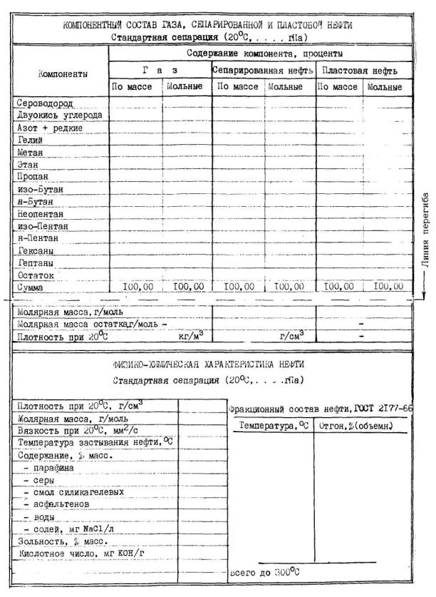 Для исследования выбраны пробы 16/1 и 16/2 - основание для выбора комплекса исследования - А, Б или В, необходимость расширения или сокращения его (п. 2.1.4.4); - виды исследования, выполненные по выбранным пробам; - методика, применяемая аппаратура; - дополнительные сведения, краткие выводы; - дата исследования, исполнители. 3.2.2.4. Форма 4. "Сведения о пласте и скважине". 3.2.2.5. Форма 5. "Условия отбора ... проб". В зависимости от исследуемых образцов (глубинные или рекомбинированные пробы), пропуск в названии формы заполняют словами: "глубинных" или"поверхностных". 3.2.2.6. Форма 6. "Основные результаты исследования". Заполняют средними значениями параметров пластовой нефти. В приложении 1 форма выполнена для комплекса Б. Для других комплексов форма должна быть соответственно сокращена или расширена, согласно объемам исследования, указанным в таблице 1. 3.2.2.7. Форма 7. "Физико-химическая характеристика сепарированной нефти". Заполняют данными физико-химического анализа нефти, полученной в результате стандартной сепарации, или данными, заимствованными из других источников. В последнем случае вместо подзаголовка "Стандартная сепарация", указывают какие данные использованы, условия сепарации и источник информации. Например: "По данным анализа нефти из трапа. Условия сепарации: 24 °С и 0,04 МПа. Отчет №...". Фракционный состав и плотности фракций, полученные при разгонке в аппарате АРН-2, могут быть представлены самостоятельной таблицей. 3.2.2.8. Форма 8. "PV- соотношения пластовой нефти". Для каждой температуры (пластовой, 20 °С и промежуточной) используют отдельный бланк формы, на котором указывают соответствующую температуру. Против значений пластового давления и давления насыщения проставляют соответствующие символы - (Рпл) и (ps). Относительный объем нефти (при всех давлениях и температурах) приводят в двух видах: по отношению к объему нефти при пластовом давлении и пластовой температуре и по отношению к объему нефти, соответствующему давлению насыщения при пластовой температуре. Значения коэффициентов сжимаемости (средние в интервале между соседними давлениями) записывают против нижнего (меньшего) давления интервала. Под таблицей указывают: - номер рисунка РV-изотермы и значение давления насыщения; - номер рисунка зависимости коэффициента сжимаемости от давления и среднее значение его в интервале от пластового давления до давления насыщения. Примечание. Если давление насыщения измерено не объемным методом, то вместо Рv-изотермы следует привести соответствующий график или копию бланка машинного расчета. Содержание самой таблицы при этом сохраняется неизменным. 3.2.2.9. Форма 9. "Температурный коэффициент давления насыщения". В таблицу заносят значения температур, соответствующие им значения давления насыщения, интервал температур и вычисленные значения температурного коэффициента давления насыщения. Под таблицей повторяют значение коэффициента, среднее для интервала от 20 °С до пластовой температуры. На этой же форме отведено место для графика зависимости давления насыщения от температуры. График не является обязательным. 3.2.2.10. Форма 10. "Температурный коэффициент объемного расширения пластовой нефти". В таблицу заносят значения давлений, интервалы температур и соответствующие значения коэффициентов объемного расширения нефти. Под таблицей повторяю