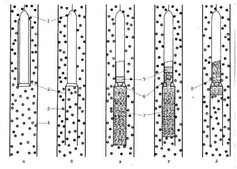 ПРИЛОЖЕНИЕ 3СправочноеСЕГРЕГАЦИОННЫЙ СПОСОБ ОТБОРА ГЛУБИННЫХ ПРОБСегрегационный способ позволяет отбирать из двухфазного нефтеводяного потока однофазную пробу нефти. Способ реализуется с помощью специального сегрегационного пробоотборника, состоящего из приемной камеры 1 и сегрегатора 2. На рисунке показана схема отбора пробы нефти из нефтеводяного потока: а - прибор с убранным сегрегатором 2 опускают на заданную глубину скважины (3 - глобулы нефти, 4 - вода); б - специальный механизм освобождает сегрегатор, который перемещается вниз, образуя ловушку для всплывающей нефти; в - в сегрегаторе под действием гравитационных сил происходит разделение нефти и воды; нефть 7, как более легкая, собирается в сегрегаторе, вытесняя из него воду; г - открывается клапан 6 и нефть, перемещая поршень 5,поступает из сегрегатора в приемную камеру; д - клапан 6 закрывается, отсекая отобранную однофазную нефть 8 в приемной камере.