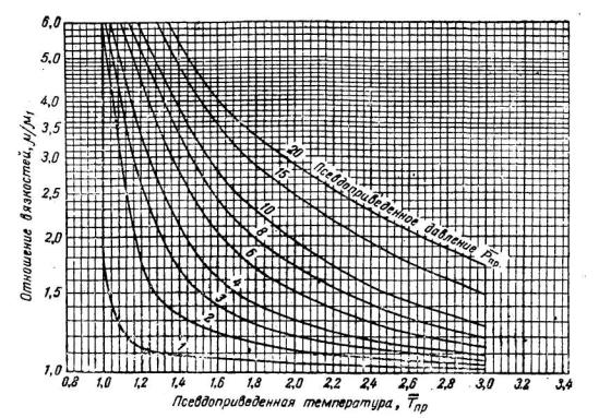4. С помощью графика 3 определяют по плотности газа 0,745 значение вязкости μ1=0,0115 мПа·с 5. По формуле (2) рассчитывают искомую вязкость при давлении 15,0 МПа и температуре 77°С μ = 0,0115·1,5=0,017 мПа·с