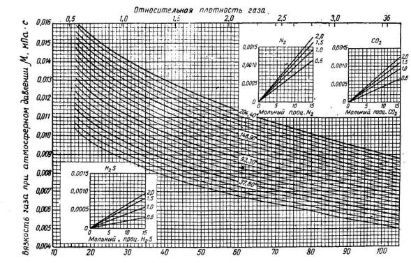 ПРИЛОЖЕНИЕ 10РекомендуемоеРАСЧЕТ ВЯЗКОСТИ ГАЗАПри отсутствии экспериментальных значений вязкости газа, выделяющегося при дифференциальном или контактном разгазировании, соответствующие данные могут быть получены с помощью корреляционных графиков 1, 2, 3 и некоторых дополнительных расчетов. 1. По относительной плотности газовой смеси с помощью графика 1