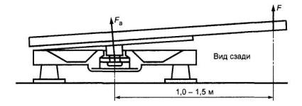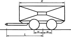 где α - эквивалент вертикального ускорения сцепного устройства в зависимости от типа системы подвески задней оси тягача. Для пневматической подвески (или систем подвески с эквивалентными амортизационными характеристиками) α = 1,8 м/с2. Для подвески других типов α = 2,4 м/с2; X - длина погрузочной поверхности прицепа, м (рисунок 1); L - расстояние от центра проушины сцепной тяги до центра оси (до середины расстояния между осями), м (рисунок 1). Примечание