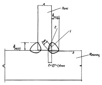 Рис. 3. Схема расчетных сечений сварного фланцевого соединения растянутого пояса (сварка полуавтоматическая):
