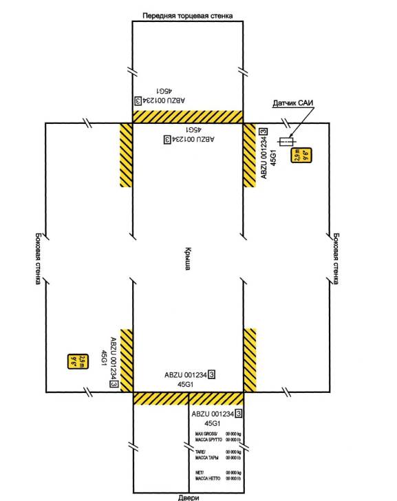 6 Воспроизведение знаков маркировки6.1 Размер и цвет знаковБуквы и цифры кода владельца, идентификатора категории оборудования, серийного номера и контрольного числа должны быть высотой не менее 100 мм (4 дюйма). Буквы и цифры для максимальной массы брутто (MAX GROSS) и тары (TARE) должны быть высотой не менее 50 мм (2 дюйма). Все символы должны быть соразмерной ширины и толщины и должны быть долговечными и контрастными по отношению к цвету самого контейнера. 6.2 Расположение знаковТребования настоящего подраздела относятся к контейнерам общего назначения. Для контейнеров других типов их необходимо максимально соблюдать. 6.2.1 Размещение и расположение знаков 6.2.1.1 Основные идентификационные знаки Код владельца, идентификатор категории оборудования, серийный номер и контрольное число на контейнерах желательно размещать на одной горизонтальной линии (рисунок 1). В случае особой конструкции контейнера их размещение может быть вертикальным (рисунок 2). Коды размера и типа контейнера наносят одной горизонтальной строкой ниже (рисунок 1) или одной вертикальной строкой рядом (рисунки 2 и 3) с выше указанными кодами. Если на специализированных контейнерах и контейнерах специального назначения невозможно полностью осуществить горизонтальное или вертикальное размещение, то основные идентификационные знаки размещают горизонтальными и вертикальными группами (рисунки 3 и 4). На специализированных контейнерах и контейнерах специального назначения, когда невозможно выполнить полностью горизонтальное или вертикальное размещение, а основные идентификационные знаки размещены по горизонтали, коды размера и типа необходимо размещать подданными основными знаками (рисунок 4). Коды размера и типа следует наносить как единое целое в соответствии с 4.2. Код владельца и идентификатор категории оборудования объединяют и размещают отдельно от серийного номера, разделяя их одним буквенным интервалом. Серийный номер и контрольное число должны быть отделены друг от друга не менее чем одним буквенным интервалом, а контрольное число должно быть заключено в рамку. Примеры расположения знаков маркировкиНа рисунках 1-4 приведены примеры расположения знаков маркировки на контейнере общего назначения, имеющем по ГОСТ Р 51876-2002, естественную вентиляцию в верхней части грузового отсека, длиной 6058 мм, шириной 2438 мм и высотой 2591 мм, с зарегистрированным кодом конкретного владельца ABZ, идентификатором категории оборудования U и серийным номером 001234. Рисунок 1-Предпочтительное горизонтальное размещение основных идентификационных знаков Рисунок 2 – Предпочтительное вертикальное размещение основных идентификационных знаков Рисунок 3 – Предпочтительное вертикальное (в несколько столбцов) размещение основных идентификационных знаков Рисунок 4 - Предпочтительное горизонтальное размещение основных идентификационных знаков - вариант расположения с горизонтальной группировкой 6.2.1.2 Основные эксплуатационные знаки Размещение максимальной массы брутто и массы тары должно соответствовать 5.1.1. Размещение символа обозначения контейнера, используемого для транспортирования воздушным и наземным видами транспорта, должно соответствовать приложению В. Размещение предупреждающего знака опасности поражения электрическим током должно соответствовать приложению С. Ра