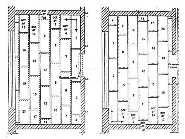 из торцовой шашки по подстилающему слою (а) и перекрытию (б) 8.15.7 Песок в прослойке при укладке шашки должен быть воздушно-сухим с влажностью не более 3%. Песчаную прослойку следует уплотнить и выровнять до укладки шашки. 8.15.8 Для битумной, прослойки и заполнения швов в торцовых покрытиях следует применять битум с температурой размягчения по способу «кольцо и шар» равной 70-80°С. 8.15.9 Для покрытий полов с повышенными требованиями к эстетике торцовые плашки рекомендуется укладывать на 2-х компонентном полиуретановом клее марки UZIN-МК 92S, предварительно прогрунтовав поверхность бетонного основания 2-х компонентной грунтовкой под клеи марки UZIN-РЕ 420 (фирма «UZIN», ФРГ). 8.15.10 Работы по устройству покрытия из торцовой шашки следует выполнять при температуре воздуха на уровне пола не ниже +5°С и вести их участками (картами) размером 12´12 м, разделёнными с помощью металлических труб диаметром 30 мм, которые размещают по линии расположения деформационных швов в покрытии. 8.15.11 Шашку следует укладывать рядами перпендикулярно направлению движения, начиная от входных дверей (ворот), в направлении «от себя» (находясь на уложенном покрытии) при песчаной прослойке по нежесткому подстилающему слою и в направлении «на себя» при прослойке из битумной мастики по бетонному подстилающему слою или железобетонному перекрытию. 8.15.12 Укладку рекомендуется начинать от одной из труб рядами, параллельными между собой и деформационному шву. При этом ряд, примыкающий к деформационному шву, должен содержать только целые шашки. 8.15.13 При устройстве покрытия из торцовой шашки её погружают с помощью металлических щипцов всеми гранями, кроме верхнего торца, в горячий битум с температурой не ниже 150°С и немедленно укладывают в покрытие вплотную к ранее уложенным шашкам с перевязкой швов не менее, чем на 1/3 их длины. Швы между шашками заполняются битумной мастикой. Толщина швов между шашками, а также величина уступа между двумя смежными шашками не должны превышать 2 мм. 8.15.14 После окончания укладки шашек по всей площади карты из деформационных швов, примыкающих к ранее уложенному покрытию, следует удалить трубы, а каналы глубиной 30 мм заполнить сухим песком и до верха шашки залить горячей битумной мастикой. 8.15.15 Эксплуатация полов допускается сразу же после остывания битумной мастики. 8.16 Покрытия дощатые8.16.1 Покрытия дощатые рекомендуется применять в комнатах, коридорах и прихожих жилых и общественных зданий, во вспомогательных и бытовых помещениях производственных зданий, спортзалах, а также животноводческих помещениях - в стойлах и боксах для коров, в станках для свиней, а также в стойлах для лошадей, групповых клетках для телят с учётом допустимых эксплуатационных воздействий, приведённых в табл. 1, 2, 3 Приложения 1. 8.16.2 Дощатые покрытия относятся к «тёплым» полам и характеризуются показателем теплоусвоения менее 9 Вт/(м2·К). 8.16.3 Для дощатых покрытий рекомендуется применять строганные доски (ГОСТ 8242-88) толщиной от 29 до 50 мм с влажностью до 12 %. В спортивных (физкультурных) залах рекомендуется применять доски толщиной не менее 37 мм. Доски должны быть антисептированы. 8.16.4 Дощатые полы в жилых, общественных и производственных зданиях, а также в спортивных (физкультурных) залах (кроме залов для лёгкой атлетики и футбола) могут быть выполнены по грунту, по бетонному подстилаю