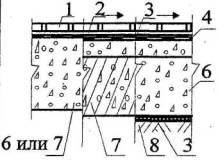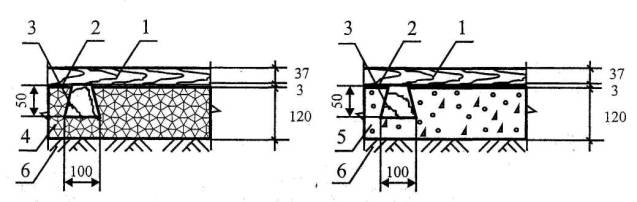Рис. 2 Последовательность операций при изготовлении сборной стяжки из фанеры 6. Тепло-звукоизоляционный слой6.1 При проектировании и устройстве теплозвукоизоляционного слоя должны соблюдаться технические требования, изложенные в Разделе I. 6.2 Для устройства слоев тепло- и звукоизоляции рекомендуется применять минераловатные плиты и стекловолокнистые плиты на синтетической связке плотностью до 150 кг/м3, минераловатные маты плотностью до 225 кг/м3, пенополистирольные плиты плотностью до 50 кг/м3, керамзитовый и кварцевый песок, а также древесно-волокнистые плиты плотностью до 250 кг/м3. 6.3 Древесноволокнистые плиты должны быть антисептированы в массе при их заводском изготовлении. 6.4 Тепло- и звукоизоляционные слои следует выполнять по выровненному основанию. При этом высушенный кварцевый и керамзитовый песок рассыпают слоями с последующим разравниванием по рейкам и уплотнением. Плиты и маты укладывают насухо с обеспечением плотности стыков между плитами и перекрытием их смежными матами. 6.5 Для утепления зон примыкания к наружным стенам полов по грунтовому основанию при расположении подстилающего слоя выше отмостки здания или ниже её не более чем 0,5 м рекомендуется предусматривать теплоизоляционные слои толщиной 0,15-0,25 м, которые размещаются под подстилающим слоем в грунтовом основании на ширине 0,8 м вдоль стены. 6.6 В местах примыкания пола к стенам и перегородкам следует предусматривать зазор шириной не менее 2 см на толщину стяжки. В полах с полимерным покрытием этот зазор следует принимать равным 4-5 мм. Зазор заполняется прокладкой из эффективного звукоизоляционного материала, в качестве которого может быть использован пенополиуретан, пенополиэтилен и т.п. 7. Гидроизоляция7.1 При проектировании и устройстве гидроизоляции должны соблюдаться технические требования, изложенные в Разделе I. 7.2 Гидроизоляцию от сточных вод и других жидкостей следует предусматривать по подстилающему слою, перекрытию или стяжке, выполненной по перекрытию или подстилающему слою. Гидроизоляцию от капиллярного поднятия грунтовых вод следует выполнять по уплотнённому грунту или монолитной стяжке (табл.7.1). 7.3 Для защиты от проникания сточных вод и нейтральных жидкостей рекомендуется применять оклеенную гидроизоляцию из битумных или битумно-полимерных материалов (табл.1 Приложение 2), наклеиваемых на цементно-песчаную стяжку или бетонный подстилающий слой методом подплавления (для наплавляемых рулонных материалов) или наклейкой на битумно-полимерных мастиках, а также эластомерные плёнки (табл.2 Приложение 2), наклеиваемые на полимерных мастиках (табл.3 Приложение 2). 7.4 Для защиты от воздействия химически агрессивных жидкостей оклеечная гидроизоляция должна выполняться из рулонных материалов и клеевых мастик, обладающих химической стойкостью к конкретной агрессивной среде. В качестве таких материалов рекомендуется применять пластины полиизобутиленовые марки ПСГ (ТУ 38-105203-87), наклеиваемые на клее 88-НП (ТУ 38-105540-85) и лакокрасочные покрытия на основе эпоксидной шпаклёвки ЭП-0010 (ГОСТ 28379-89), армированные стеклотканью, и эпоксидные и полиуретановые составы марок UZIN-Epoxidicht и UZIN-Epoxiflex Plus (фирма «UZIN», ФРГ).