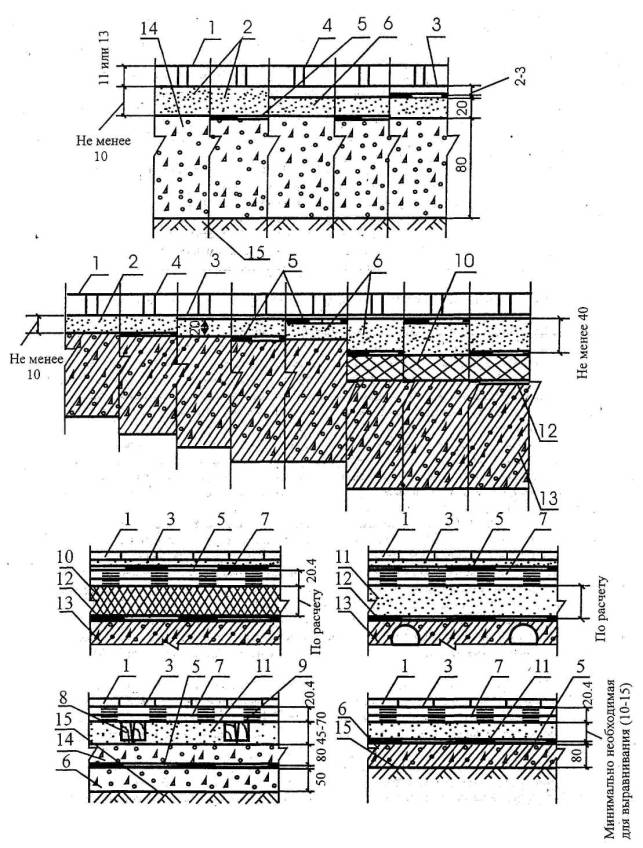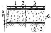 8.7.6 Для асфальтобетонных жестких смесей рекомендуется применять битум с температурой размягчения 50-60 °С, а для литых - битумы с температурой размягчения 50 °С и 70 °С в соотношении 1:2 по массе. 8.7.7 Для щелочестойкого асфальтобетона следует использовать щебень, гравий и минеральный порошок из плотных осадочных (серпентинитов, порфиритов, известняков, доломитов) или изверженных (диабазов, гранитов) пород. 8.7.8 Для кислотостойкого асфальтобетона следует использовать щебень, песок и минеральный порошок из каменных материалов (диабаза, андезита, кварца и др.), кислотостойкость которых по ГОСТ 473.1-81 составляет не менее 94%, а прочность при сжатии не менее 80 МПа (800 кг/см2). 8.7.9 Для безыскрового и неэлектропроводного асфальтобетона следует использовать щебень, песок и минеральный порошок из известняка, мрамора и других искронеобразующих каменных материалов. 8.7.10 Литые асфальтобетонные смеси должны быть однородными с равномерным распределением битума на зёрнах заполнителя. Температура литой асфальтобетонной смеси при приготовлении должна быть в летний период 180-200 °С, а в зимний 200-210 °С, при укладке - 160 °С, а при уплотнении - не ниже 120 °С. 8.7.11 Поверхность основания из бетона или цементно-песчаного раствора перед укладкой асфальтобетона следует огрунтовать раствором битума в бензине при соотношении 1:2-3 по массе. 8.7.12 Асфальтобетонную смесь рекомендуется укладывать в 1-2 слоя полосами шириной 2 м, ограниченными рейками. При этом первую рейку следует располагать на расстоянии 10-15 см от стены, а последующие через 2 м. Маячные рейки высотой на 7-10 мм более проектной толщины покрытия должны укладываться по уровню и быть закреплены распорками во избежание их смещение при уплотнении асфальтобетонной смеси. 8.7.13 После укладки асфальтобетона на первой полосе и его уплотнения последующие полосы следует заполнять через одну. Толщина одного слоя асфальтобетона не должна превышать 25 мм. 8.7.14 Уплотнение асфальтобетонной смеси следует выполнять катками массой 50-80 кг с электронагревателями. Уплотнение жестких асфальтобетонных смесей в местах, недоступных для механических катков (около стен, колонн, фундаментов под оборудование и т.п.) следует производить вибраторами с электрообогревом и частотой колебаний 2000-3000 в 1 мин. 8.7.15 Работы по изготовлению покрытий полов целесообразно осуществлять без технологических перерывов. В противном случае перед возобновлением работ после перерыва кромка ранее уложенного асфальтобетона должна быть вертикально обрублена, разогрета и прогрунтована горячим битумом. 8.7.16 После уплотнения асфальтобетонной смеси катком лицевой слой следует присыпать сухим мелкодисперсным песком и притереть деревянной тёркой, облицованной стальным листом. 8.7.17 Эксплуатация полов допускается через 24 часа после укладки. 8.8 Поливилацетатцементно- и латексцементно-бетонные покрытия8.8.1 Полы с поливилацетатцементно- и латексцементно-бетонными покрытиями рекомендуется применять в производственных помещениях с учётом допустимых эксплуатационных воздействий, приведённых в табл. 1, 2, 3 Приложения 1. 8.8.2 Поливилацетатцементно- и латексцементно-бетонные покрытия могут выполняться по бетонному подстилающему слою и по железобетонному перекрытию (рис. 10). 8.8.3 По аналогии с мозаично-бетонными покрытиями поливилацетатцементно- и латексцементно-бето