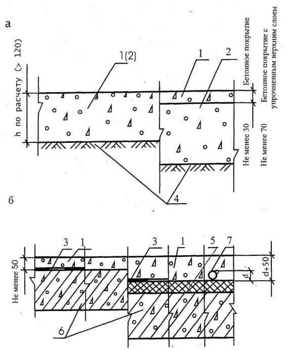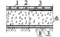 слою (а) и по перекрытию (б) 8.8.8 Основные требования технологии производства работ по укладке, уплотнению и отделке как нижнего слоя из цементно-песчаного раствора, так и верхнего слоя из поливилацетатцементно- и латексцементно-бетонных смесей те же, что и при устройстве мозаичных покрытий. Для обеспечения прочного сцепления верхнего слоя с затвердевшим нижним слоем последний очищают от мусора, обеспыливают пылесосом и грунтуют дисперсией или латексом, разбавленными водой в соотношении по объёму 1:10 (дисперсия или латекс:вода). 8.8.9 При укладке и твердении смесей температура самой смеси, воздуха на уровне пола и температура нижележащего слоя должна быть не ниже 10°С. Такая температура должна поддерживаться до приобретения бетоном прочности не менее 50% от проектной. 8.8.10 Поливилацетатцементно- и латексцементно-бетонные покрытия после их устройства должны выдерживаться во влажных условиях (покрытие полиэтиленовой плёнкой и т.п.) не менее 7 суток, затем осуществляется естественная сушка. Возможно также использование композиций, наносимых на влажную бетонную поверхность и образующих плёнку, с целью предотвращения преждевременного удаления влаги из бетона. Как правило, в качестве таких композиций используются однокомпонентные составы на основе акриловых дисперсий, в частности герметик-упрочнитель марки Master-Cur 113 (концерн «МВТ», Бельгия). 8.8.11 Использование для предотвращения преждевременного высыхания бетона таких композиций на покрытиях, по которым планируется нанесение полимерных пропиток, не рекомендуется. 8.8.12 Нанесение композиций на основе акриловых дисперсий осуществляется валиком сразу же после выполнения заглаживания в два слоя. 8.8.13 После достижения бетоном воздушно-сухого состояния возможно также использование пропиточных композиций, составы которых и технологии нанесения приведены в главе 9. 8.8.14 Эксплуатация полов допускается после приобретения бетоном проектной прочности на сжатие, а пешеходное движение может быть допущено при достижении прочности на сжатие не менее 5 МПа. 8.9 Монолитные полы из лёгких бетонов с латексцементные покрытием8.9.1 Полы из лёгких бетонов с латексцементным покрытием рекомендуется применять в животноводческих зданиях с учётом допустимых эксплуатационных воздействий, приведённых в табл. 1, 2, 3 Приложения 1. 8.9.2 Легкобетонные полы с утепляющим слоем и латексцементным покрытием относятся, к тёплым полам (показатель теплоусвоения не выше 15 Вт/(м2·°С)) и рекомендуются применяться в свинарниках и откормочниках крупного рогатого скота при бесподстилочном содержании животных. 8.9.3 Не допускается устройство таких полов в проездах и проходах животноводческих зданий. 8.9.4 Полы из лёгких бетонов с латексцементным покрытием выполняются по грунтовому основанию (рис. 11). Они включают теплоизоляционный слой из керамзитового гравия по ГОСТ 9759-83 или аглопоритового щебня фракции 20-40 мм по ГОСТ 11991-83 толщиной 100 мм, подстилающего слой из керамзитобетона или аглопоритобетона класса В3,5 плотностью 1000 кг/м3 или аглопоритобетона класса В5 плотностью 1200 кг/м3 и покрытие из латексцементного раствора марки 150 толщиной 20 мм. 8.9.5 В подстилающем слое предусматриваются температурно-усадочные швы толщиной 15-20 мм с шагом не более 20 м, которые располагают под межклеточными или между стойловыми перегородками. Полост