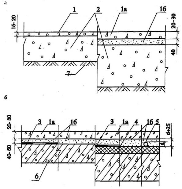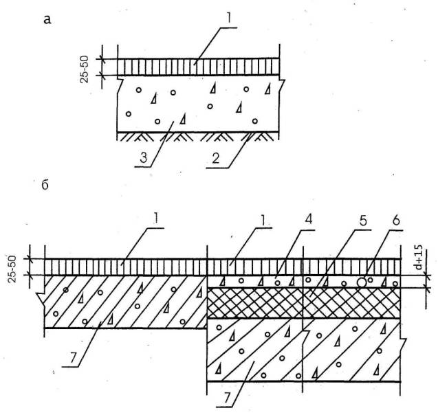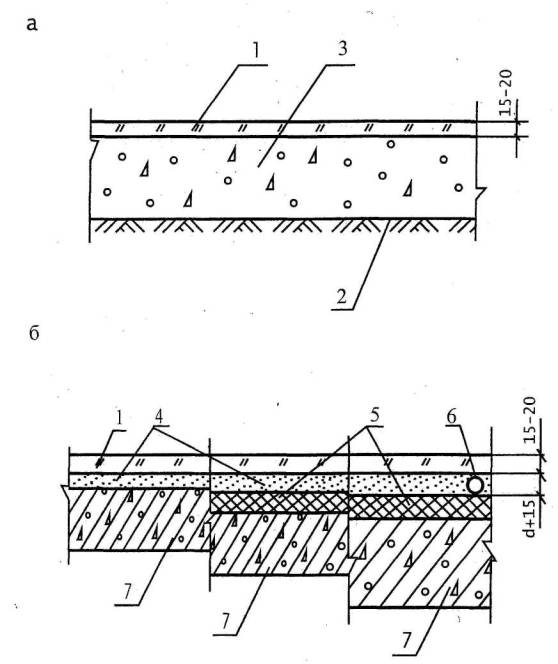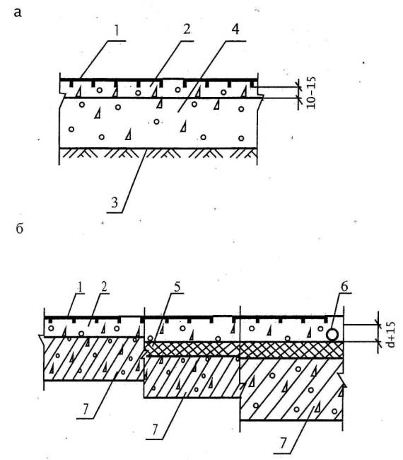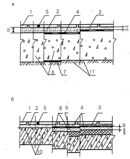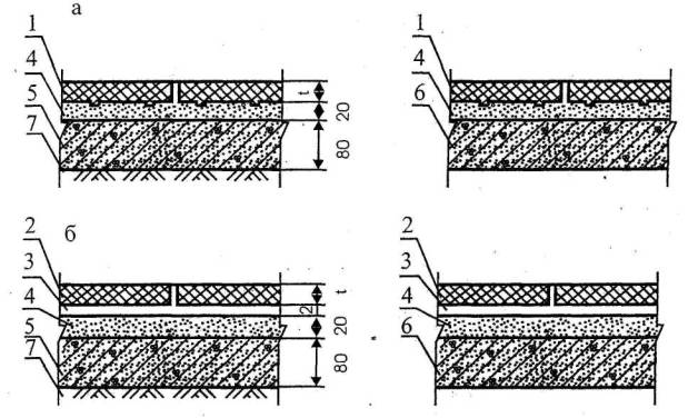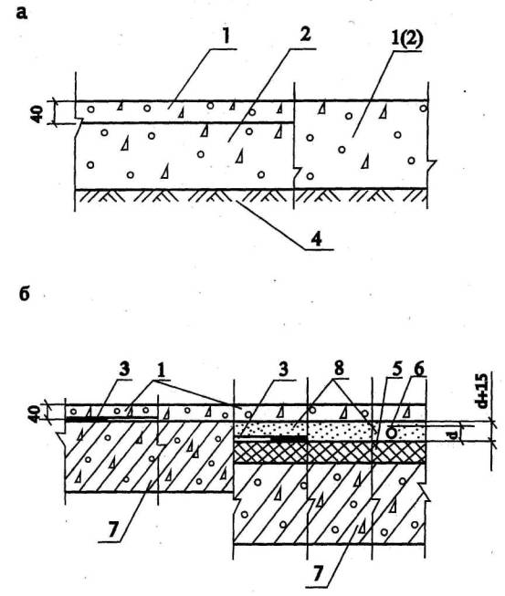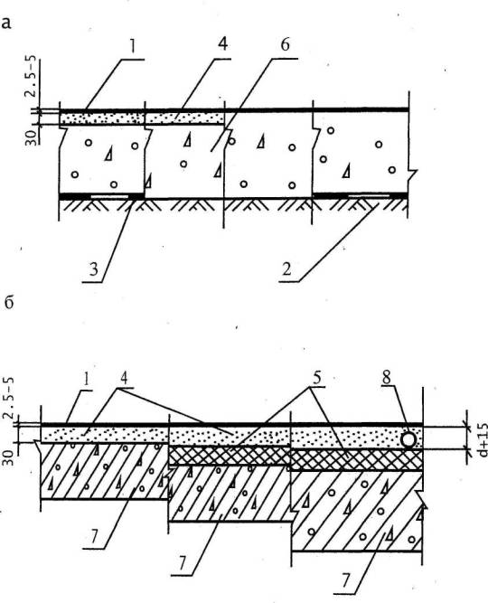 покрытием по подстилающему слою (а) и по перекрытию (б)