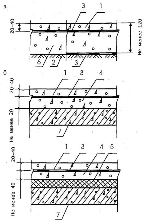мозаично-бетонным покрытием по подстилающему слою (а) и по перекрытию (б) 8.3.3 Мозаично-бетонное покрытие, как правило, выполняется в два слоя. Нижний слой предусматривается толщиной 40-50 мм из цементно-песчаного раствора, а верхний (лицевой) - толщиной от 20 до 30 мм в зависимости от интенсивности механических воздействий (Раздел I, табл. 2) из мозаичной смеси. При этом нижний слой толщиной 40 мм рекомендуется выполнять по бетонному основанию или стяжке, а толщиной 50 мм - по сплошному тепло- и звукоизоляционному слою. При наличии в конструкции пола трубопроводов толщину нижнего слоя следует принимать на 25 мм большей диаметра трубопровода. 8.3.4 Прочность нижнего слоя из цементно-песчаного раствора и мозаичного покрытия на сжатие должна быть не менее 20 МПа. 8.3.5 Для обычных мозаичных покрытий рекомендуется применять бетоны с осадкой конуса 2-4 см, приведённые в таблице 8.3.1, а для цветных - составы, представленные в таблице 8.3.2.