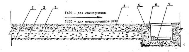 лёгких бетонов с латексцементным покрытием 8.9.6 Полы должны иметь уклон в сторону навозосборного канала, величину которого рекомендуется принимать в помещениях для крупного рогатого равным 3,5%, а в свинарниках - 5%. 8.9.7 В качестве мелкого заполнителя для легкого бетона подстилающего слоя, а также заполнителя для латексцементного раствора следует применять песок керамзитовый по ГОСТ 9759-83 или песок аглопоритовый по ГОСТ 11991-83. 8.9.8 В качестве вяжущего для легкого бетона и латексцементного раствора следует применять портландцемент марки 400, отвечающий требованиям ГОСТ 10178-85, с содержанием минеральных добавок не более 10%. 8.9.9 Латекс СКС-65ГП марки Б, используемый в качестве компонента полимерцементного раствора, должен удовлетворять требованиям ТУ 38.103111-83. Латекс должен транспортироваться и храниться при температуре не ниже +5°С. 8.9.10 Для полов животноводческих зданий рекомендуется следующий состав лёгкого бетона из расчёта на 1 м3 смеси: цемент марки 400, кг 200-220 гравий керамзитовый или щебень аглопоритовый фракций 10-40 мм, м3 1,0 песок керамзитовый или аглопоритовый фракции 1-5 мм, м3 0,2 вода, литр 140-150 8.9.11 Рекомендуемое соотношение компонентов латексцементного раствора марки Ml50 для устройства покрытия (в мас.ч.): цемент : латекс : песок : вода составляет 1:(0,1-0,2):2,4:0,35. Заполнитель в растворе должен состоять по объёму из 50% керамзитового или аглопоритового песка и 50% кварцевого песка. Соотношение компонентов раствора следует уточнить на строительной площадке на опытных образцах. Водопоглощение покрытия в затвердевшем состоянии должно составлять не более 5%. 8.9.12 Приготовление легкого бетона и латексцементного раствора следует производить в смесителях принудительного или гравитационного действия. 8.9.13 Загрузка смесителей материалами для приготовления бетонной смеси производится в следующей последовательности: крупный пористый заполнитель, керамзитовый или аглопоритовый песок, цемент. Вода подаётся постепенно по мере загрузки заполнителя и цемента. Продолжительность перемешивания 2-3 минуты. 8.9.14 Осадка конуса, характеризующая подвижность бетонной смеси для подстилающего слоя, должна составлять не более 20 мм. 8.9.15 При приготовлении латексцементного раствора загрузку компонентов следует производить в следующей последовательности: заполнители - песок керамзитовый или аглопоритовый, строительный песок, цемент, латекс, вода. Продолжительность перемешивания 3-4 минуты. 8.9.16 Подвижность латексцементной растворной смеси следует оценивать по расплыву конуса на встряхивающем столике согласно ГОСТ 310.4-81. Расплыв конуса должен быть не более 120 мм. 8.9.17 Устройство конструктивных слоев пола следует производить после устройства навозосборного канала, до установки перегородок и сантехнического оборудования. В местах установки стоек перегородок следует устраивать колодцы соответствующих размеров с использованием инвентарных пустотообразователей. 8.9.18 Утепляющий слой выполняется из керамзитового гравия или аглопоритового щебня толщиной после уплотнения 100 мм с образованием уклона в сторону навозосборного канала. 8.9.19 Устройство подстилающего слоя следует выполнять с соблюдением рекомендаций главы 3. 8.9.20 При укладке и твердении легкобетонных смесей температура самой смеси, воздуха на уровне пола и температура нижележащего слоя должна быть