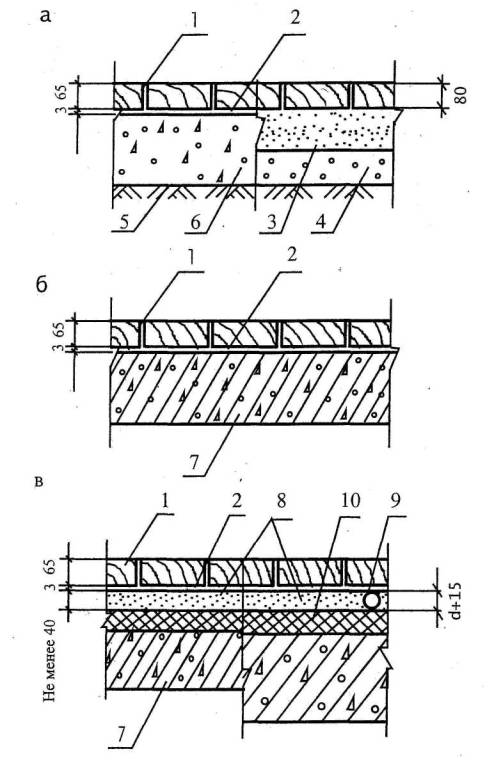 монолитным цементно-песчаным или гипсовым стяжкам (а) и черновому деревянному