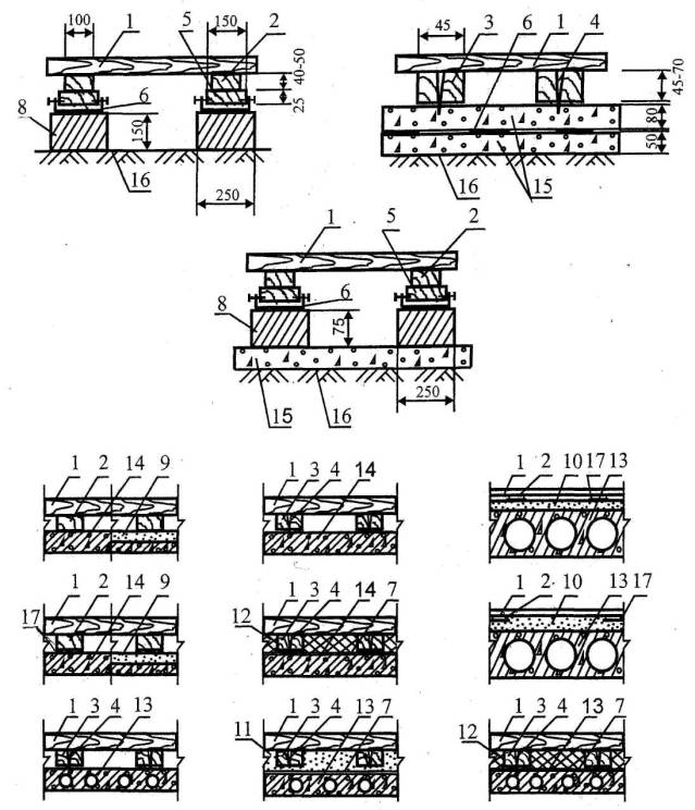 покрытием в животноводческих зданиях 8.16.5 При устройстве полов по грунту, если уровень их в цокольном или подвальном помещении ниже уровня отмостки, следует предусмотреть бетонную подготовку из бетона класса В 12,5 толщиной 80 мм по слою щебня, утрамбованному в грунт на глубину не менее 40 мм. По бетонной подготовке устанавливают столбики из кирпичной кладки или бетона. 8.16.6 При устройстве полов по грунту, когда их уровень выше уровня отмостки здания, столбики устанавливают непосредственно по утрамбованному грунту. 8.16.7 Для столбиков под лаги в полах, устраиваемых на грунте рекомендуется применять обыкновенный глиняный кирпич (ГОСТ 530-54) марки 75 и выше и цементно-песчаный раствор марки не ниже М25 или бетон класса В 12,5. Устройство столбиков из силикатного кирпича и других искусственных камней, понижающих прочность при увлажнении, не допускается. 8.16.8 Для предотвращения появления капиллярной влаги в элементах пола и загнивания деревянных изделий на столбиках предусматривают гидроизоляцию из двух слоев рулонного битумного или битумно-полимерного материала, на котором размещают деревянные прокладки, а по ним укладывают лаги. Края гидроизоляционного рулонного материала должны быть выпущены из-под прокладок на 30-40 мм и прикреплены к ним гвоздями. 8.16.9 Ширина деревянных прокладок, укладываемых по столбиками под лаги в полах на грунте, должна быть 100-150 мм, длина 200-250 мм, а толщина не менее 25 мм. Влажность прокладок не должна превышать 18 %. 8.16.10 Древесноволокнистые плиты для звукоизоляционных прокладок должны соответствовать требованиям ГОСТ 4598-60 и быть антисептированными. 8.16.11 В полах по перекрытию в помещениях с нормируемыми показателями звукоизоляции лаги следует укладывать по звукоизолирующим прокладкам. 8.16.12 По междуэтажным беспустотным железобетонным перекрытиям толщиной более 140 мм под лаги укладывают ленточные прокладки толщиной 12-20 мм и шириной 100-120 мм из древесноволокнистых или древесностружечных плит плотностью 250 -350 кг/м3. 8.16.13 Если толщина железобетонного перекрытия менее 140 мм под лаги дополнительно (для повышения звукоизоляции пола) устраивается песчаная засыпка толщиной до 20 мм из сухого песка. Вместо песчаной засыпки могут укладываться ленточные прокладки из древесно-волокнистых или древесно-стружечных плит шириной 300-350 мм. 8.16.14 В качестве звукоизоляционных засыпок под лаги на междуэтажных перекрытиях применяют минеральные сыпучие материалы (песок, каменноугольный шлак и др.) с крупностью зёрен не более 10 мм с содержанием пыли (зёрен мельче 0,15 мм) не более 15%, без органических примесей, с влажностью не более 4 %. Применение засыпок из пылевидных материалов (зола-унос и др.) и строительного мусора не допускается. 8.16.15 По многопустотным панелям перекрытий песчаную засыпку предусматривают толщиной 30-40 мм, а по ней дополнительные звукоизоляционные прокладки толщиной 40 мм из древесноволокнистых или древесностружечных плит. 8.16.16 В конструкциях полов, к которым не предъявляются требования по их звукоизоляции, лаги укладывают, втапливая их в выравнивающий слой из песчаной засыпки. 8.16.17 Высота подпольного пространства в полах на грунте (расстояние от основания или подстилающего слоя до дощатого покрытия пола) должна быть не- более 250 мм, а в полах на перекрытиях (расстояние от плиты перекрытия или звукоизоляционного сло