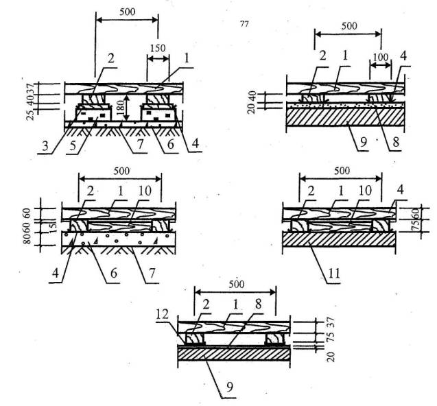 Рис. 21 Последовательность операций при установке регулируемых лаг и закрепления к ним сборной стяжки 8.16.34 Каждая доска дощатого покрытия должна быть прибита к лаге гвоздями длиной в 2-2,5 раза больше толщины доски. Гвозди следует забивать в пласт досок наклонно с втапливанием шляпок. Ряды гвоздей вдоль лаг должны быть прямолинейными. 8.16.35 Стыки торцов досок покрытия, торцов с боковыми кромками досок и стыки боковых кромок смежных досок без шпунтового соединения между ними (например, в дверных проемах) следует располагать на лагах и выполнять с тщательной подгонкой по прямой линии, не допуская образования щелей. Каждую из смежных досок, опирающихся на общую лагу, следует прибивать к этой лаге. 8.16.36 Деревянные полы в залах для спортивной гимнастики в связи с необходимостью надёжного крепления гимнастических снарядов и значительных динамических нагрузок рекомендуются выполнять из бруска сечением 60´60 мм (рис. 19). Покрытие пола может быть выполнено двухслойным с прокладкой между слоями бумаги или пергамина. 8.16.37 При покрытии из брусков в качестве лаг рекомендуется применять бруски сечением 75´75 мм с шагом 500 мм и с установкой между ними в шахматном порядке с шагом 2,5 м связей из бруска 60´60 мм. 8.16.38 В тех случаях, когда спортзал располагается на втором этаже и под ним находятся вспомогательные помещения с постоянным пребыванием людей, необходимо предусматривать звукоизоляцию с установкой под лагами пола звукоизоляционных ленточных прокладок из прошивных минераловатных матов толщиной 40-50 мм, из минераловатных матов толщиной 30-40 мм на синтетической связке, из минераловатных или стекловолокнистых плит толщиной 40-50 мм на синтетической связке или древесноволокнистых изоляционных плит толщиной 16-20 мм. 8.16.39 Для устранения уступов между досками или брусками и провесов после настилки полов поверхность покрытия выравнивают строгальными или шлифовальными машинами. 8.16.40 Для проветривания подпольного пространства полов на грунте в помещениях, расположенных на 1 этаже зданий без технического подполья, стен и перегородок должны быть предусмотрены щелевые плинтусы, либо в покрытии пола или галтелях оставлены отверстия в двух противоположных углах помещения. Отверстия общей площадью 20-30 см2 следует перекрыть металлическими решетками, возвышающимися над полом на 7-10 мм. 8.16.41 По периметру помещения устанавливаются плинтусы, закрепляемые гвоздями либо только к стене, либо только к покрытию пола. 8.16.42 После окончания всех строительных работ в помещении остроганные и отшлифованные дощатые полы очищают от стружек и опилок, грунтуют, а затем шпаклюют. Высохший шпаклёвочный слой зачищают шлифовальными машинами или вручную при помощи пемзы и наждачной бумаги, а затем окрашивают, нанося окрасочные составы за два раза. 8.16.43 Дощатые полы в животноводческих помещениях могут быть выполнены по глинобитному или по бетонному подстилающему слою (рис. 20). 8.16.44 Бетонный подстилающий слой в полах животноводческих помещений рекомендуется выполнять из бетона класса В7,5 толщиной 80 мм, а глинобитный - толщиной 120 мм. 8.16.45 В животноводческих помещения для дощатых покрытий рекомендуется применять строганные доски (ГОСТ 8242-88) толщиной не менее 37 мм с влажностью до 12 %. Доски должны быть антисептированы. 8.16.46 Для лаг должны использоваться нестроганные доски (ГОСТ 