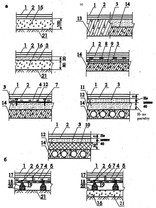 из кислотостойкого бетона по подстилающему слою (а) и по перекрытию (б) 8.6.5 Щебень, песок и минеральный порошок должны изготавливаться из каменных материалов (диабаза, андезита, кварца и др.), кислотостойкость которых по ГОСТ 473.1-81 составляет не менее 94%, а прочность при сжатии не менее 80 МПа (800 кг/см2). Крупность щебня не должна превышать 15 мм. Допускается применение природного кварцевого песка, а в качестве минерального порошка - природного пылевидного кварца (маршалита) или кислотоупорного цемента (с учётом количества Na2SiF6 находящегося в нём). 8.6.6 Песок и минеральный порошок должны быть рыхлыми, не содержать глины, извести и примесей органических веществ. 8.6.7 Минеральный порошок должен содержать зёрна мельче 0,075 мм в количестве не менее 70%. 8.6.8 В качестве вяжущего следует применять натриевое жидкое стекло с модулем 2,4-3,0 и плотностью 1,38-1,40 г/см3. 8.6.9 Кремнефтористый натрий с содержанием чистого Na2SiF6 не менее 93% для отверждения жидкого стекла должен иметь влажность не более 1%. 8.6.10 В качестве уплотняющей добавки рекомендуется применять фуриловый спирт (ОСТ 59-127-73). 8.6.11 При изготовлении кислотостойкого раствора и бетона следует предварительно перемешать жидкое стекло с уплотняющей добавкой, затем добавить песок и порошок в смеси с кремнефтористым натрием, а для бетона дополнительно щебень с последующим перемешиванием смеси до получения гомогенной массы. 8.6.12 Укладку кислотостойкой смеси следует производить при температуре воздуха не ниже +10 °С. Эта температура должна поддерживаться до приобретения бетоном не менее 70%-ной проектной прочности. 8.6.13 Технология укладки кислотостойкого бетона аналогична технологии устройства покрытий из обычного бетона. 8.6.14 При плитном варианте покрытия рекомендуется использовать плиты размером 500´500 мм и массой до 20 кг. 8.6.15 Плиты следует укладывать на прослойку толщиной 20-25 мм из кислотостойкого раствора (см. табл. 8.6.1) рядами, параллельными стенам помещения или по специальному рисунку. 8.6.16 Эксплуатация полов допускается после приобретения кислотостойкими бетоном и раствором прослойки проектной прочности на сжатие, а пешеходное движение может быть допущено не ранее приобретением бетоном монолитных покрытий прочности на сжатие не менее 5 МПа, а раствором прослойки - не менее 2,5 МПа. 8.7 Асфальтобетонные покрытия8.7.1 Асфальтобетонные покрытия пола рекомендуется применять в полах промышленных зданий с учётом допустимых эксплуатационных воздействий, приведённых в табл. 1, 2, 3 Приложения 1. 8.7.2 В животноводческих зданиях асфальтобетонные покрытия полов рекомендуется применять в станках, стойлах, клетках и т.д. при содержании животных на подстилке или при использовании ковриков или решёток, а также в проездах и проходах. 8.7.3 Асфальтобетонные полы могут выполняться по бетонному, гравийному или щебёночному подстилающему слою и по железобетонным перекрытиям (рис. 9). Для утепления асфальтобетонных полов в станках, стойлах и клетках животноводческих зданий их рекомендуется выполнять по керамзитобетонному или аглопоритобетонному подстилающему слою. 8.7.4 Толщину покрытия пола в производственных зданиях следует назначать в зависимости от интенсивности механических воздействий по таблице 1 Приложения 1, а в животноводческих помещениях принимать равной 20 мм.