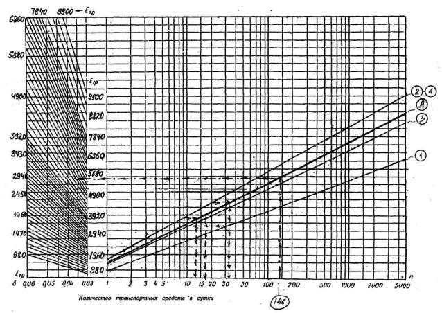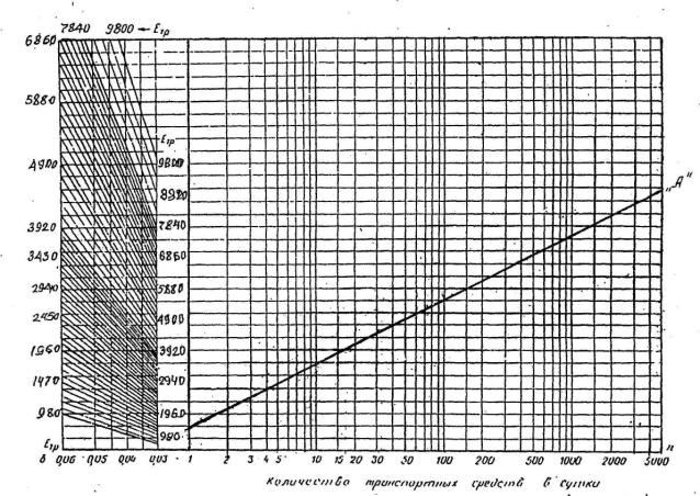 Для каждого значения Ni определяют эквивалентное, по воздействию на пол, количество условных автомобилей с расчётной нагрузкой «A» (Nia) следующим образом: - для конкретного транспортного средства на рис. 1 проводят специальную для него наклонную прямую, ординаты точек которой равны ординатам точек наклонной линии «А», умноженным на коэффициент η = p´D/l666 данного транспортного средства; - из точки на оси «п», отвечающей значению Ni, восстанавливают перпендикуляр до пересечения с полученной наклонной линией; - из полученной точки пересечения проводят линию, параллельную оси «п» до пересечения с наклонной линией «А»; - из точки пересечения опускают перпендикуляр на ось «п». Полученное значение на оси п соответствует значению Nia. 1.5 Расчётную интенсивность движения определяют по формуле: Np = γ·ΣNiA (3) где ΣNiA - определяется суммированием значений NiA для каждой марки транспортного средства; γ - коэффициент распределения движения по ширине проезда, принимаемый равным при количестве полос движения 1, 2 и 3 соответственно 2, 1 и 0,75.