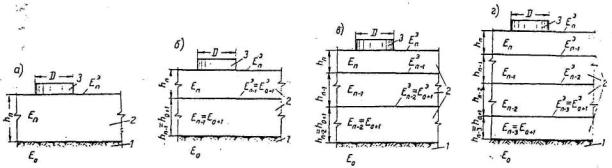 Рис. 2. Расчетные схемы полов с нежестким подстилающим слоем Модули деформации материала отдельных слоев принимают по табл. 1.2, а грунта основания по табл. 1.3. Толщину отдельных слоев пола принимают по Разделу I. Толщину прослоек и мастик, а также гидроизоляционных слоев от сточных вод и других жидкостей включают в толщину покрытия. Толщину прослоек, расположенных на подстилающем слое, не учитывают. Материалы для подстилающего слоя следует выбирать так, чтобы расчётный модуль деформации материала каждого вышележащего слоя превышал в 1,5-3,5 раза расчётный модуль деформации материала нижележащего слоя пола или грунта основания. 1.9 Расчёт прочности пола производят следующим образом: - По значению D и Еэп = Етр, а также Еn и hn для n-го верхнего слоя (рис. 2) вычисляют отношения hn/D и Еэп / Еп; - По рис. 3 определяют эквивалентный модуль деформации Еэп-i всех слоев пола и основания, расположенных ниже верхнего слоя. Для этого из точки на горизонтальной оси, соответствующей конкретному значению h/D, проводят перпендикуляр до пересечения с кривой со значением, равным Еэп/Еп. Полученная точка пересечения переносится параллельно оси h/D влево на ось (Еi-1/Еi). Полученное значение на этой оси соответствует отношению Еэп-i /En = Кэп откуда определяют Еэп-1 = Кэп En. - Зная Еэп-1; Еп-1; hп-1; D, аналогичным путём определяют Еэп-2 и т.д. В итоге определяют эквивалентный модуль деформации Еэ0+1 на поверхности первого снизу слоя пола; - По значениям Еэ0+1; Е0+1 ; Е0 вычисляют отношения Еэ0+1/Е0+1 и Е0/Е0+1 , здесь Е0 -модуль деформации грунта основания, принимаемый по таблице 1.3, a Е0+1 - модуль деформации нижнего слоя пола. - Точку на оси (h/D = 0), соответствующую значению Е0/Е0+1 переносят параллельно оси h/D на кривую со значением Еэ0+1/Е0+1. Из полученной точки на этой кривой опускают перпендикуляр на ось h/D. Значение на этой оси соответствует отношению hэ0+1/D = а1 откуда hэ0+1 = а1D. Если толщина подстилающего слоя получается меньше величин, приведённых в Разделе I, или если Еэ0+1 больше, чем Е0+1 то толщина подстилающего слоя принимается согласно указаниям Раздела I. 1.10 Полученная по расчёту толщина подстилающего слоя может быть уменьшена путём повышения прочности основания, например путём устройства искусственного основания (песчаного и др.) или путём понижения уровня грунтовых вод и др. Примеры расчёта прочности пола с нежёстким подстилающим слоем Пример 1 Требуется определить толщину нежесткого подстилающего слоя в неотапливаемом складе. По полу склада при ширине проезда 3,5 м за сутки проходит следующее количество транспортных средств: электрокары (двухосные) - 30 машин; автопогрузчики (двухосные) - 20 машин; автомобили ЗИЛ-130 (двухосные) - 20 автомобилей; автомобили ЯАЗ-210 (трехосные) - 5 автомобилей. Покрытие пола из асфальтобетона толщиной 4 см. Подстилающий слой из щебня прочностью при сжатии 9000 Н/см2. Грунт основания супесчаный. Горизонт грунтовых вод находится на глубине 0,4-0,5 м. Расчёт. При покрытии из асфальтобетона величина относительной деформации δ = 0,035 (табл. 1.2). По формуле (2) приведём количество трёхосных автомобилей ЯАЗ-210 к двухосным: Ni = 1,8·5 = 9 автомобилей Определим эквивалентное, по воздействию на пол, количество условных автомобилей с расчётной нагрузкой «А». Для этого вычисляем значение коэффициента «η». Расчётные характеристики транспортных средств (предоставляемые заказчиком) заносим в т