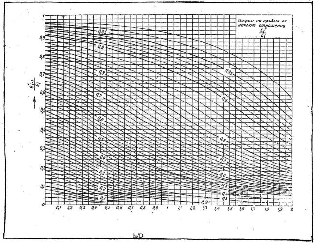 Рис. 4 График для приведения интенсивности движения транспортных средств к интенсивности движения условного автомобиля с расчетной нагрузкой «А» и для определения требуемого модуля деформации Етр пола Уменьшение толщины подстилающего слоя может быть также достигнуто устройством искусственного основания, например из крупного песка, уложенного на грунте основания. Для этого случая принимаем расчётную схему «в» по рис. 2. Задаёмся толщиной щебёночного подстилающего слоя, равной 15 см, расчётные модули деформации: покрытия Е3 = 23520 Н/см2, подстилающего слоя Е2 = 12740 Н/см2, искусственного основания E1 = 3430 Н/см2, грунт основания Е0 = 1176 Н/см2. Толщина асфальтобетонного покрытия h3 = 4 см. Толщина подстилающего слоя из щебня h2 = 15 см. Еэ3 = Eтр =5098 Н/см2; D = 34 см; Еэ2/Е3 = 0,184 и Еэ2 = 0,184·23520 = 4327 Н/см2. Определим Еэ1 для чего сначала вычислим отношения h2/D = 15/34 = 0,441 и Еэ2/Е2 = 4327/12740 = 0,34. По рис. 3 определяем Еэ1/Е2 = 0,203, откуда Еэ1 = 0,203·12740 = 2586 Н/см2. Определим h1, для чего сначала вычислим отношения Еэ1/Е1 = 2586/3430 = 0,754 и Е0/Е1 = 1176/3430 = 0,3430. По рис. 3 определим h1/D = 1,28, откуда h1 = 1,28·34 = 43,5 см. Таким же путём определяется толщина искусственного основания, если задаться иными толщинами подстилающего слоя (например, 12 см, 18 см и т.д.). Из рассмотренных вариантов толщины подстилающего слоя наиболее целесообразный определяют по технико-экономическим соображениям. Пример 2 Требуется определить толщину нежесткого подстилающего слоя пола. Нагрузка Р = 10 т. Форма следа опирания на пол - прямоугольник размером 50´40 см, площадь F1 = 2000 см2. Удельное давление р = 49 Н/см2. Помещение неотапливаемое. Покрытие пола из торцовой шашки толщиной 8 см. Подстилающий слой гравийный, с содержанием 75% зёрен крупнее 2 мм. Грунт основания - пылеватый суглинок. Грунтовые воды находятся на глубине 3 м. Расчёт. Определим расчётные