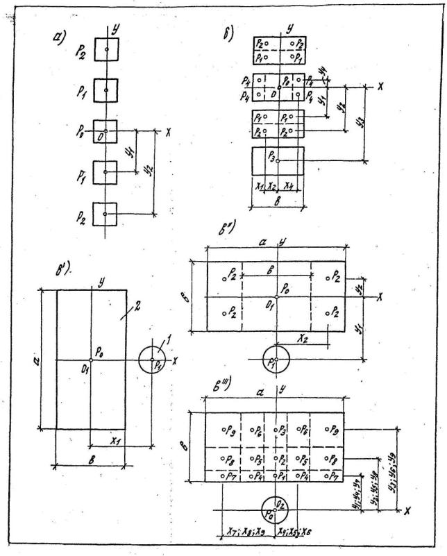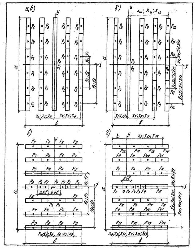 Полученное значение σр = 0,67 МПа отличается от Rδt = 0,675 МПа менее чем на 5%. Принимаем подстилающий слой из бетона класса по прочности на сжатие В22,5 толщиной h = 19 см. Пример 4 Требуется определить толщину бетонного подстилающего слоя пола при нагрузке от валов, укладываемых на пол краном. Длина вала 7 м, диаметр 40 см, вес 1 м вала 9,8 кН (0,98 т). Валы могут располагаться по отдельности или в штабелях в два ряда по высоте. Покрытие пола отсутствует, бетонный подстилающий слой является покрытием. Грунт основания - суглинок. Уровень грунтовых вод на отметке «-1,5 м», следовательно пол находится в зоне опасного капиллярного поднятия грунтовых вод и в связи с этим требуется устройство наливной гидроизоляции из слоя щебня с пропиткой битума. Определим расчётные параметры. Нагрузка от одного вала со следом прямоугольной формы, согласно п. 2.4, относится к нагрузкам простого вида, а от нескольких рядом лежащих валов - к нагрузкам сложного вида. Для грунта основания из суглинка, расположенного в зоне опасного капиллярного поднятия вод, находим по табл. 2.2 К0 = 45 Н/см3. Для подстилающего слоя примем бетон класса по прочности при сжатии В22,5. Тогда для помещения, где выполняются полы с устройством гидроизоляции (согласно п. 2.2 группа V) и укладка валов осуществляется кранами, примем по табл. 1 Rδt = 0,675 МПа, Еб = 28500 МПа. Согласно п. 2.15 рассмотрим расчётные схемы нагрузок (рис. 3). Расчётные центры О, согласно табл. 2.8, поместим в центре тяжести следов валов, а ось ОУ расположим параллельно следам валов.