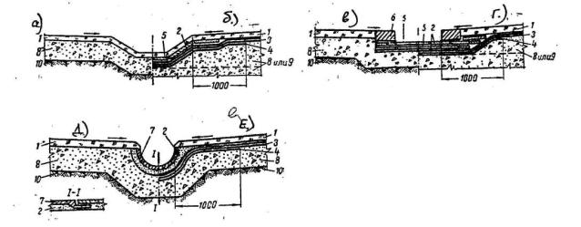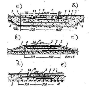 Рис. 6 Полы в зоне железнодорожных путей 1 - разборное покрытие из железобетонных плит размером 1400·700 мм; 2 - то же, из брусчатки, клинкерного кирпича, торцовой шашки; 3 - покрытие пола; 4 - железобетонные шпалы; 5 - металлические шпалы; 6 - песчаный балласт, 7 - оклеечная гидроизоляция; 8 - бетонный подстилающий слой; 9 - плита перекрытия; 10 - грунт основания; 11 - окаймление из угловой стали. Приложение 7Перечень, стандартов и ТУ на материалы, применяемые при устройстве полов
