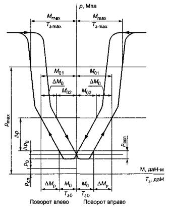 - упругий люфт рулевого механизма; aм - механический люфт рулевого механизма; 7.6.3 Характеристики распределителя интегральных и полуинтегральных рулевых механизмов Рулевой механизм устанавливают на стенде, собирают гидравлическую систему усилителя, включают насос, из системы удаляют воздух, рабочую жидкость прогревают до температуры от 50 °С до 70 °С. Клапан-ограничитель давления стенда регулируют на давление (1 ¸ 1,1)pmax, клапан расхода - на производительность Q. Сошку или рейку (у реечного механизма) закрепляют в среднем положении. К рулевому валу прикладывают момент М, обеспечивающий плавный поворот вала из среднего положения до момента срабатывания клапана ограничения давления рулевого механизма или, если таковой отсутствует, клапана ограничения давления гидравлической системы стенда. Затем момент М плавно уменьшают таким образом, чтобы обеспечить плавный возврат рулевого вала в исходное положение (приложение к рулевому валу момента противоположного знака не допускается). В исходном положении рулевой вал освобождают, затем таким же образом его поворачивают в противоположном направлении и вновь возвращают в исходное положение. Испытание проводят три раза. В процессе испытаний регистрируют угол поворота рулевого вала a, момент на рулевом колесе М и давление в гидросистеме р. В результате получают: p = f(a) - нагрузочная характеристика распределителя и p = f(M) - характеристика реактивного свойства распределителя в соответствии с рисунками 5 и 6. Из этих характеристик непосредственно определяют следующие показатели: р0 - давление холостого хода; Dр0 - давление нецентрирования; a0 - гидравлический люфт (см. рисунок 5); amax - угол поворота рулевого вала, соответствующий давлению pmax (см. рисунок 6); М0 - момент на рулевом валу, соответствующий включению усилителя (см. рисунок 6); Мmax- момент на рулевом валу, соответствующий давлению pmax (см. рисунок 6). По характеристике на рисунке 6 рассчитывают: R0 - эффективность реактивного свойства распределителя, которую определяют по формуле
