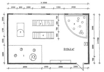 Рис. П. 13. Кабинет занятий ЛФК (на 5 человек) с раздевалкой и кладовой