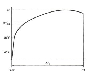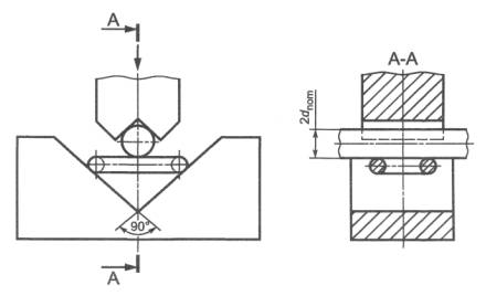 где Lnom - номинальная длина образца, мм; Lnom = pn (n - число звеньев образца; p - номинальный шаг); ΔLt - удлинение при разрыве, мм; ΔLt = Lt – Lnom (Lt - длина образца при разрыве). 6.5 Испытание на изгиб 6.5.1 Испытательная установка Испытания на изгиб проводят с помощью установки, требования к которой установлены в приложении В. 6.5.2 Метод испытания Каждое звено образца устанавливают в испытательное устройство и подвергают испытанию согласно приложению В. После испытаний образец должен соответствовать требованиям 6.6 настоящего стандарта и требованиям соответствующего стандарта комплекса ЕН 818. 6.6 Критерии приемки Если два или три испытуемых образца номинальной