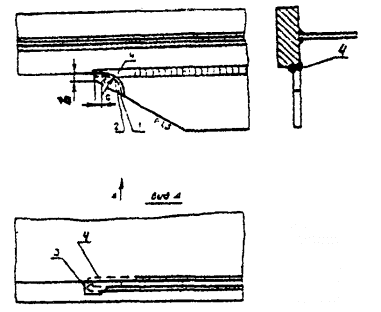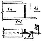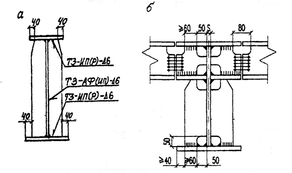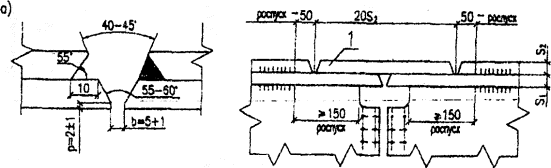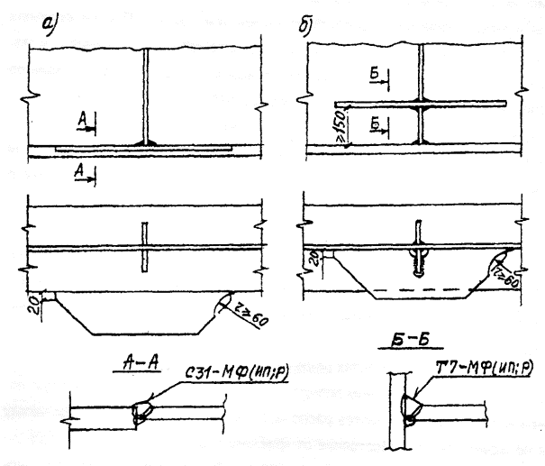 Рис. 3. Заводская подготовка стыков пакетных поясов под монтажную сваркуа - нижнего пояса; б - верхнего пояса; 1 - монтажная вставка 4.6. Вертикальные (или поперечные) промежуточные ребра жесткости сплошностенчатых изгибаемых балок и коробок железнодорожных, автодорожных, городских и пешеходных мостов рекомендуется приваривать к стенке и поясам непрерывными угловыми швами (рис. 4, а) или проектировать их с устройством скругленных вырезов номинальными размерами 50x50 мм (рис. 4, б). Вырезы обязательны, если по технологии сборки и сварки (преимущественно Коробчатых и П-образных сечений) поясные швы проваривают полуавтоматом после постановки и приварки поперечных ребер или диафрагм. 4.7. Длину угловых швов на торцах ребер следует принимать не менее 80 мм (п. 4.147 СНиП 2.05.03-84*). Расстояние от свободной кромки растянутого пояса балки до свободной кромки ребра должно быть не менее 40 мм (см, рис. 4, а, б снизу), Для опорных ребер это расстояние можно уменьшить до 20 мм (рис. 5, сеч. 1-1). В местах: примыкания ребер к поясам, фасонкам и другим ребрам; пересечения продольных и поперечных ребер плит; обрыва стенок балок в монтажных соединениях; обрыва продольных ребер ортотропных плит; в технологических проемах (отверстиях) и т.д. - необходима обварка угловыми швами по кромкам и торцам стыкуемых деталей по контуру.