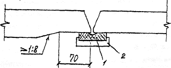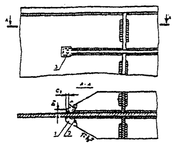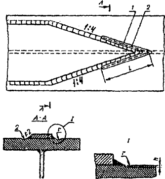Рис. 7. Подготовка элементов нижних поясов разной толщины под монтажную сварку1 - медная подкладка; 2 - стальная прижимная обойма 4.15. В комбинированных фрикционно-сварных стыках главных балок монтажные сварные соединения верхних поясов из одиночных листов или двухлистовых пакетов следует проектировать, как правило, без вставки, с обеспечением проектного зазора при заводском изготовлении см. (рис. 1, б) и скругленными вырезами s стенке под верхним поясом симметрично нижним вырезам. Для цельнометаллических пролетных строений с ортотропными плитами верхние вырезы допускаются упрощенной формы с размерами не менее 50×50 мм, если они удовлетворяют требованиям расчета конструкции на выносливость (см. рис. 1, в). 4.16. Количество стыков поясов назначается из условия рационального заводского раскроя листового металлопроката. 4.17.* В составе проекта производства работ (ППР) должны быть разработаны строповочные приспособления и устройства для монтажа блоков главных балок, ортотропных и ребристых плит. По согласованию с проектной организацией - разработчиком чертежей КМ допускается сверление монтажных отверстий диаметром 25 мм в настильных листах ортотропных и ребристых плит. Отверстия рекомендуется указывать в чертежах КМД и сверлить на заводе. 5. ИЗГОТОВЛЕНИЕ ДЕТАЛЕЙ И МОНТАЖНЫХ ЭЛЕМЕНТОВПравка, очистка и консервация металлопроката5.1. Листовой прокат, подаваемый в обработку, должен быть выправлен на листоправильной машине с количеством валков не менее семи независимо от исходного состояния проката. Зазор между поверхностью выправленного листа, уложенного на розную горизонтальную плоскость, и ребром стальной линейки длиной 1 м не должен превышать 1,5 мм для любой толщины листа. При настройке листоправильной машины следует соблюдать пределы допустимости правки в холодном состоянии - минимально допустимый радиус кривизны r³50×S и максимально допустимый прогиб f £ l2/400 S, где: S - толщина листа; l - длина деформируемой (или деформированной в неправленом листе) части (табл. 2, приложение А). На листоправильной машине должны быть указатели величины зазора между рядами средних валков (С) и превышения крайних нижних валков над средними (л). Рекомендуемый порядок и режимы правки листового проката приведены в приложении А. При правильно подобранном режиме лист выправляется за один проход. Количество проходов (при необходимости) не должно превышать шеста. На листоправильных машинах запрещается править волнистость кромок и саблевидность листа или полосы с помощью прокладок. 5.2. Волнистость универсального и полосового проката правят на листоправильных машинах, а саблевидность и винтообразность - на горизонтальных правильно-губочных прессах. Волнистость полосовых заготовок из листа толщиной больше 40 мм допускается править на горизонтальных правильно-гибочных прессах с установкой металлических прокладок на выпуклостях деформированных участков. 5.3. Для правки фасонного углового проката рекомендуется применять сортоправильные машины открытого типа с консольным расположением роликов, а также о возможностью их замены и изменения шага. Входящий угол роликов и, соответственно, угол прижимных роликов рекомендуется принимать равным 90°20'. На сортоправильных машинах при применении роликов соответствующей формы допускается правка двутавров, швел