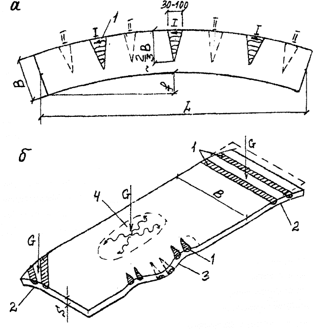 Рис.8. Правка деформированных листова - термическая, саблевидности; б - термомеханическая, волнистости, "бахромы" по кромке, выпуклости ("хлопуна"), G -статическая нагрузка (пригруз), 1 - зоны нагрева; 2 - волнистость; 3 - "бахрома" по кромке; 4 - выпуклость ("хлопун") 5.6. Волнистость толстого листа (20 мм и более), "бахрому" по кромке и выпучивания ("хлопуны") выправляют преимущественно термомеханическим способом с приложением статических усилий и наметкой зон нагрева по схемам, приведенным на рис. 8, б. Металл во всех случаях предпочтительно нагревать с выпуклой стороны, однако при выправке "хлопуна" плоский пригруз ставят на выпуклость, а нагрев производят снизу. Принципы термической и термомеханической правки, изложенные в п.п. 5.4-5.6, справедливы также для правки сортового и фасонного проката. 5.7. Термическую и термомеханическую правку должны выполнять специально обученные и аттестованные рабочие-газоправильщики. В процессе обучения они должны приобрести опыт визуального определения температуры нагрева стали по цвету каления и с помощью специального устройства (рис. 9). Периодически, по графику, утвержденному главным инженером завода, но не реже чем через 6 месяцев, газоправильщики должны проходить проверку приобретенного навыка определения температуры на данном приборе. Для контроля температуры нагрева металла рекомендуется использовать оптические пирометры излучения и цифровые термометры ТЦ-1000.