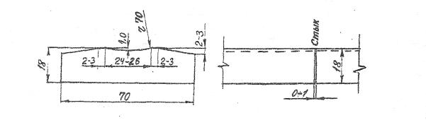 Примечания: 1. Для сварки наружных швов применять проволоку Св-08ГА диаметром 2 мм, флюсы АН-348-АМ, АНК-561, АНЦ-1М. Для сварки внутренних швов - проволоку Св-08А или Св-08 АА диаметром 2 мм, флюсы АН-348-АМ, АНК-561, АНЦ-Ш. 2. Электроприхватки выполнять вручную электродами типа Э42А, Э46А, Э50А диметром 4 мм или полуавтоматической сваркой в защитных газах проволокой Св-08Г2С диаметром 1,2...1,6 мм. 3. При сварке наружных швов герметично закрытых коробчатых элементов решетчатых пролетных строений режимы назначаются в соответствии с данной таблицей. 8.11. Направление оси электродной проволоки при сварке стыковых соединений должно быть по оси симметрии зазора. При многопроходной сварке с Х-образными скосами кромок это требование относится лишь к сварке первых двух слоев с каждой стороны соединения. Последующее заполнение разделки кромок следует производить, как правило, со смещением электродной проволоки в одну, и другую сторону с последующим перекрытием швом по центру. 8.12. Двустороннюю автоматическую сварку под флюсом с металлохимической присадкой (МХП) на флюсовой подушке надлежит выполнять с соблюдением нижеследующих условий: а) стыковые соединения из стали по ГОСТ 6713-91* толщиной 20 мм и по ТУ 14-1-5120-92 толщиной до 16 мм собирать под автоматическую сварку без разделки кромок с зазором 4±1 мм; стыки листов толщиной 25...40 мм (ГОСТ 6713-91*) и толщиной 20-40 мм (ТУ 14-1-5120-92) должны иметь V-образную подготовку кромок с общим углом раскрытия 55±5°, притуплением кромок 10±1 мм, шириной зазора 4±1 мм; б) сварочные материалы для автоматической сварки стыковых и тавровых соединений с МХП следует применять в соответствии с табл. 8, а; в) перед наложением первого шва в стыках листов толщиной до 20 мм из стали по ГОСТ 6713-91* без разделки кромок зазор заполнять металлохимической присадкой полностью. В стыках листов толщиной 25...40 мм из стали по ГОСТ 6713-91* и в стыках листов толщиной 20...40 мм из стали по ТУ 14-1-5120-92 с V-образной разделкой кромок МХП перед первым проходом автомата засыпается на высоту h - 12...17 мм (меньшие значения относятся к сталям 15ХСНДА, 10ХСНДА, большие - к сталям 15ХСНД и 10ХСНД). Высота засыпки МХП контролируется специальным шаблоном; г) после выполнения стыковой сварки с первой стороны изделие перекантовать, не расплавившуюся присадку (МХП) удалить металлической щеткой. Шов с обратной стороны проварить за один проход автомата без МХП; д) режимы автоматической сварки с МХП стыковых соединений листов толщиной 20…40 мм из сталей по ГОСТ 6713-91* и ТУ 14-1-5120-92 приведены в табл. 18. Автоматическую сварку угловых швов тавровых соединений с МХП выполняют однодуговым автоматом в положении "в лодочку". МХП дозируют с помощью, шаблона, причем номер шаблона должен соответствовать катету треугольника, образуемого засыпаемой присадкой: