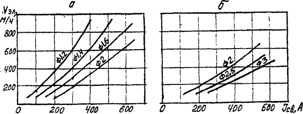 Рис. 18. Графики зависимости между скоростью подачи сварочной проволоки, диаметра проволоки и силой сварочного токаа - для проволоки сплошного сечения, б- для порошковой проволоки Вылет сварочной проволоки 1 в зависимости от ее диаметра для неимпульсных режимов рекомендуется принимать по графикам, приведенным на рис. 18, а - для проволоки оплошного сечения и на рис. 19, б - для порошковой проволоки. Вылет свыше 40 мм увеличивает разбрызгивание металла. Режимы полуавтоматической сварки в защитных газах порошковой проволокой (в том числе самозащитной)