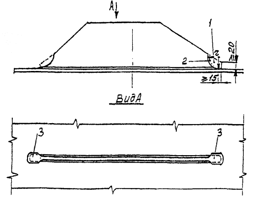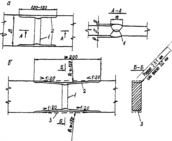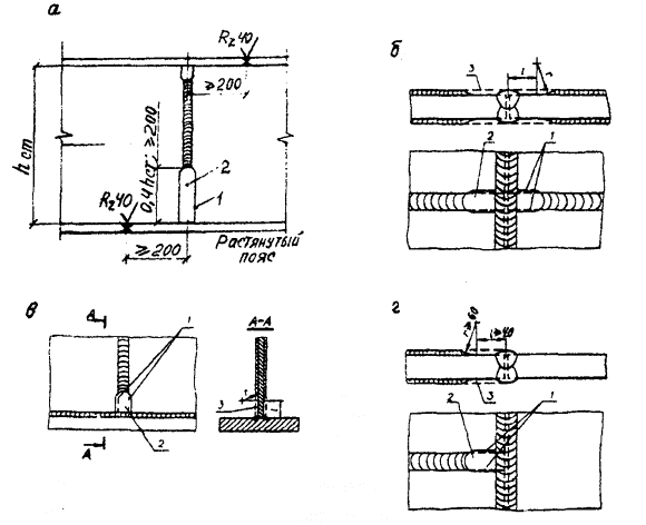 Рис.5.* Схема взаимного расположения ребер жесткости и стыковых швов сплошностенчатой балки:1 - опорное ребро; 2 - продольное ребро; 3 - поперечное ребро 4.10. Распорки и диагонали продольных связей, распорки поперечных связей не допускается приваривать непосредственно к поясам балок пролетных строений всех назначений. Связи непосредственно к поясам можно прикреплять только на высокопрочных болтах. При невозможности такого решения в автодорожных мостах элементы связей к главным балкам допускается присоединять через фасонки, привариваемые встык к поясам (рис. 6, а) или в тавр к стенкам балок (рис. 6, б). В первом случав должно обеспечиваться сплошное проплавление сварного соединения и механическая обработка концов швов для получения плавных переходов к поясу радиусом не менее 80 мм (см, рис. 6, а справа). Во втором случав сплошное проплавление не требуется, а механическую обработку на концах швов выполняют только на фасонках, к которым примыкают диагонали продольных связей. В железнодорожных мостах фасонки связей приваривают встык к поясным листам балок с обеспечением сплошного проплавления и плавных переходов к основному металлу с механической обработкой концевых участков швов. Длина стыкового шва (т.е. длина фасонки) должна быть не менее 800 мм. Если верхний пояс балки выполнен в виде двухлистового пакета, то фасонки приваривают встык к нижнему листу пакета.