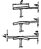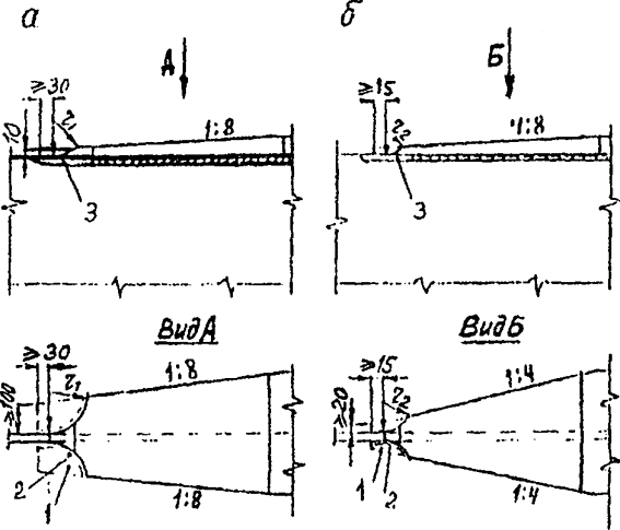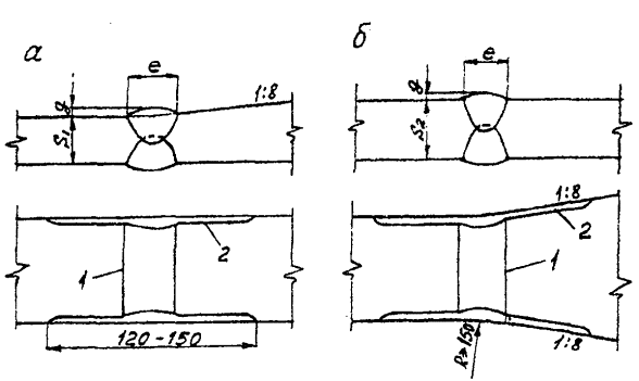 Рис. 1. Схемы подготовки монтажных стыков спошностенчатых балок при заводском изготовленииа - цельносварного; б - комбинированного болто-сварного; в - вариант проема стенки для сварки верхнего пояса; 1- вставка верхнего пояса д) в ортотропных плитах - в угловых швах на концах стенок поперечных валок вблизи продольных стыковых швов настильных листов с поясами главных балок или плит между собой. Длина роспуска не более 100 мм; е) в ортотропных плитах, подлежащих укрупнению в монтажные блоки не менее чем из трех (по ширине) заводских отправочных марок - в угловых швах на концах продольных ребер с двух торцов плиты (длина роспуска 100 мм); в одиночных плитах - роспуск 100 мм на концах продольных ребер с одного торца плиты (со стороны припуска листа настила). В зоне продольного монтажного стыкового сварного соединения главной балки с ортотропной плитой рекомендуется не приваривать на заводе к поясному листу торцы вертикальных ребер с выкружками, к которым впоследствии прикрепляются стенки поперечных балок ортотропных плит. После стыковки плит с балками приварка этих торцов ребер к поясам обязательна (п. 4.133 СНиП 2.05.03-84*). 4.3.* При разработке чертежей КМ проектной организации рекомендуется назначать припуски по 50 мм на подрезку кромок под сварные монтажные соединения: а) в стыках однолистовых поясов главных балок или вставок; б) по продольным кромкам настильных листов средних ортотропных плит (находящихся в замкнутом контуре), если их количество по ширине более двух; в) по торцам настильных листов средних и консольных ортотропных плит (тыловые по направлению монтажа кромки); г) по торцам вставок сварных стыков продольных ребер нижних ребристых плит; д) по кромкам вставок стенок главных балок в цельносварных стыках. 4.4. Изменение сечений элементов, соответствующее изменению усилий в них должно быть плавным с уклонами 1:81 (рис. 2). Уширение поясных листов предусматривают, как правило, симметричным (рис. 2, а), утолщение поясных листов выполняют с одной стороны - снаружи или изнутри (со стороны стенки для конструкций, монтируемых способом продольной надвижки по элементам скольжения, рис. 2, б); изменение толщины стенок балочных конструкций делают симметричным, причем в зонах монтажных стыков предусматривают прямолинейный участок длиной не менее 800 мм (рис. 2, в). 1 В элементах конструкций, воспринимающих усилия сжатия от эксплуатационных и монтажных нагрузок, допускаются уклоны 1:4.