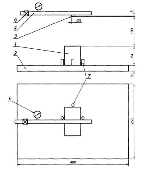 - стальную плиту размерами (400 ± 10)×(250 ± 10)×(20 ± 3) мм со штифтами, определяющими положение образцов. Общий вид плиты и устройства для обдува приведен в приложении А. Схема расположения испытательного оборудования приведена в приложении Б.