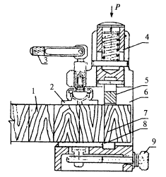 1 - образец; 2 - прижимная опора; 3 - рукоятка; 4 - пуансон; 5 - нож пуансона; 6 - корпус; 7 - клеевое соединение; 8 - передвижная опорная площадка; 9 - винт упора Рисунок 5 - Приспособление для испытаний на послойное скалывание 7.2.4. Образец испытывают до разрушения с постоянной скоростью перемещения пуансона и фиксируют разрушающую нагрузку Р, которую определяют с погрешностью не более 50 Н. Предел прочности клеевого соединения вычисляют по формуле (1). При необходимости для сравнения показателей прочности древесины и клеевого соединения идентичным образом проводится скалывание древесины вне зоны клеевого соединения. При проведении испытаний должны соблюдаться требования пп. 5.4 - 5.7 и 7.1.5. 7.3. Определение предела прочности зубчатых клеевых соединений при поперечном изгибе 7.3.1. Метод применяют при заводском контроле качества склеивания заготовок по длине. 7.3.2. Образцы для испытаний выпиливают из слоев, подготовленных для склеивания, в виде прямоугольной призмы с зубчатым клеевым соединением посередине длины. Длина образца должна быть не менее 15-кратной его толщины. За толщину образца h принимают размер по направлению приложения нагрузки. Средняя (рабочая) часть