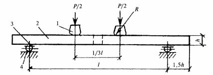 от видимых пороков древесины (допускаются пластевые сучки диаметром не более Образцы должны иметь поперечное сечение (толщину и ширину), равное полному сечению слоя. Если оборудование не позволяет испытывать образцы полного сечения, допускается испытание образцов уменьшенного сечения. В этом случае заготовки распиливают на несколько образцов равной ширины, каждый из которых испытывают. 7.3.3. Испытания проводят по схеме, указанной на рисунке 6, с приложением нагрузки в третях пролета на ее пласть. Результаты испытаний образцов, разрушившихся за пределами рабочей части по допускаемым порокам и дефектам на концах образца, не учитывают.