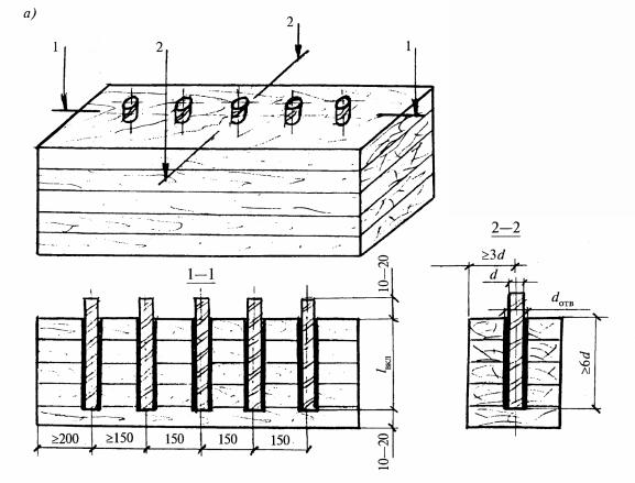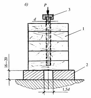 1 - нагружающие ножи с R, равным (1,5-2)h; 2 - образец; 3 - цилиндрический шарнир; 4 - опора Рисунок 6 - Схема испытаний зубчатых клеевых соединений при поперечном изгибе 7.3.4 Значение предела прочности зубчатого клеевого соединения определяют по формуле σ = Pl/(bh2), (2) где Р - разрушающая нагрузка, Н; l - величина пролета испытуемого образца, м; b - ширина сечения образца, м; h - высота сечения образца, м. 7.3.5. При проведении испытаний должны соблюдаться требования пп. 5.4 - 5.7 и 7.1.5. 7.4. Определение прочности вклеивания металлических стержней при устройстве узловых соединений 7.4.1. Определение прочности вклеивания металлических стержней в древесину осуществляют путем механических испытаний образцов на сдвиг при сжатии (продавливание). Образцы изготавливают специально и одновременно с осуществлением вклеивания стержней при устройстве узловых соединений элементов конструкций. 7.4.2. Заготовка для вклеивания стержней и размеры образца для испытаний показаны на рисунке 7 ,а. Условия изготовления образцов (размеры отверстий, диаметр стержней и их подготовка, рецептура и состояние клея, условия выдержки и др.) должны быть идентичными условиям изготовления узловых соединений реальных конструкций. 7.4.3. Испытания образцов производят не ранее чем через 3 суток после заливки клея при температуре воздуха (20±2)°С. 7.4.4. Испытания образцов проводят в соответствии со схемой, приведенной на рисунке 7,б. Образец в испытательном прессе необходимо устанавливать строго вертикально, причем вертикальная ось образца должна совпадать с центральной вертикальной осью прижимного башмака пресса. При этом производят испытания поочередно каждого вклеенного стержня в заготовке, не распиливая ее. После испытаний для определения характера разрушения рекомендуется заготовку распилить и путем выкалывания обнажить стержни. 7.4.5 Предел прочности соединений при сдвиге в МПа определяют по формуле τ = Рразр/πdотвlвкл, (3) где Рразр - разрушающая нагрузка, Н; lвкл - длина заделки, м; dотв - диаметр отверстия, м.