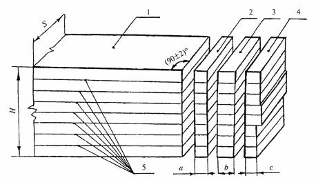 (75,0 ± 3,0) мм; с ≥ Рисунок 8 - Принципиальная схема выпиливания образцов для испытаний Длина образца вдоль волокон древесины должна быть (75 ± 3) мм. Высота и ширина образца должны соответствовать размерам поперечного сечения изделия или конструкции. Допускается деление образцов по высоте сечения на меньшие части (пропил должен проходить по слою древесины на равном расстоянии от клеевых швов). Испытанию подлежат все части образца. 8.1.3. До испытаний подсчитывают число клеевых швов в образце, измеряют ширину образца и длину клеевых швов на обеих торцевых его поверхностях. 8.1.4. Образцы помещают в автоклав с водой так, чтобы обеспечивался свободный доступ воды к их торцам. Образцы в автоклаве должны быть полностью покрыты водой. Температура воды должна быть (15 ± 5)°С. 8.1.5. Образцы выдерживают в воде под вакуумом (0,08 ± 0,01) МПа в течение 1 ч, затем под давлением (0,5 ± 0,03) МПа в течение 3 ч, после чего помещают в сушильную установку, предварительно осушив поверхность образцов. Образцы в сушильной