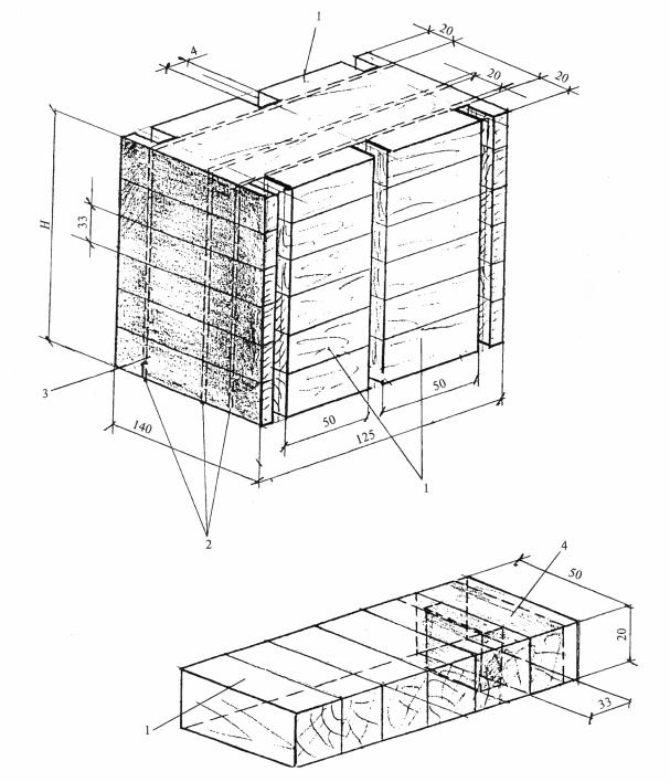 1 - заготовка для выпиливания образцов для испытаний на скалывание по ГОСТ 15613.1; 2 - пропилы при выпиливании заготовок; 3 - торцы образцов (перед вымачиванием покрыть эпоксидной шпатлевкой ЭП-001); 4 - образец для испытаний на скалывание по ГОСТ 15613.1 Рисунок 10 - Схема распиливания образца для испытаний на расслаивание В образце-срезе толщиной 8.1.15. После проведения