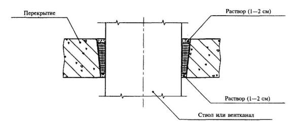б) угловое (правое или левое) Рисунок 2. Взаимное расположение проемов в перекрытиях под ствол и вентканал 4.3 При монтаже оборудования мусоросборной камеры должны соблюдаться следующие требования с учетом инструкций заводов-изготовителей. 4.3.1 Ввод стволов мусоропровода в мусоросборную камеру осуществляется через перекрытие с помощью поставляемых в комплекте оборудования опоры ствола, виброизолирующего амортизатора, направляющих патрубков (прямых или наклонных) и шибера, располагаемых в камере. 4.3.2 Угол наклона направляющего патрубка не должен превышать 20° к оси ствола. Оборудование, не соответствующее указанному, к монтажу не допускается. 4.3.3 Первоначально устанавливаются в рабочее положение и выверяются опоры ствола на предусмотренной виброизолирующей прокладке. 4.3.4 Производится звукоизоляция перекрытия мусоросборной камеры от опоры ствола. Изоляция производится согласно прилагаемой схеме (рис. 3) указанными далее материалами или их равноценными заменителями. По ее окончанию оформляется акт скрытых работ.